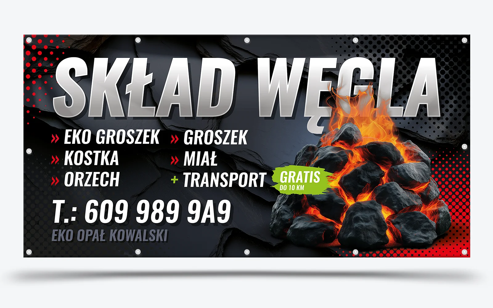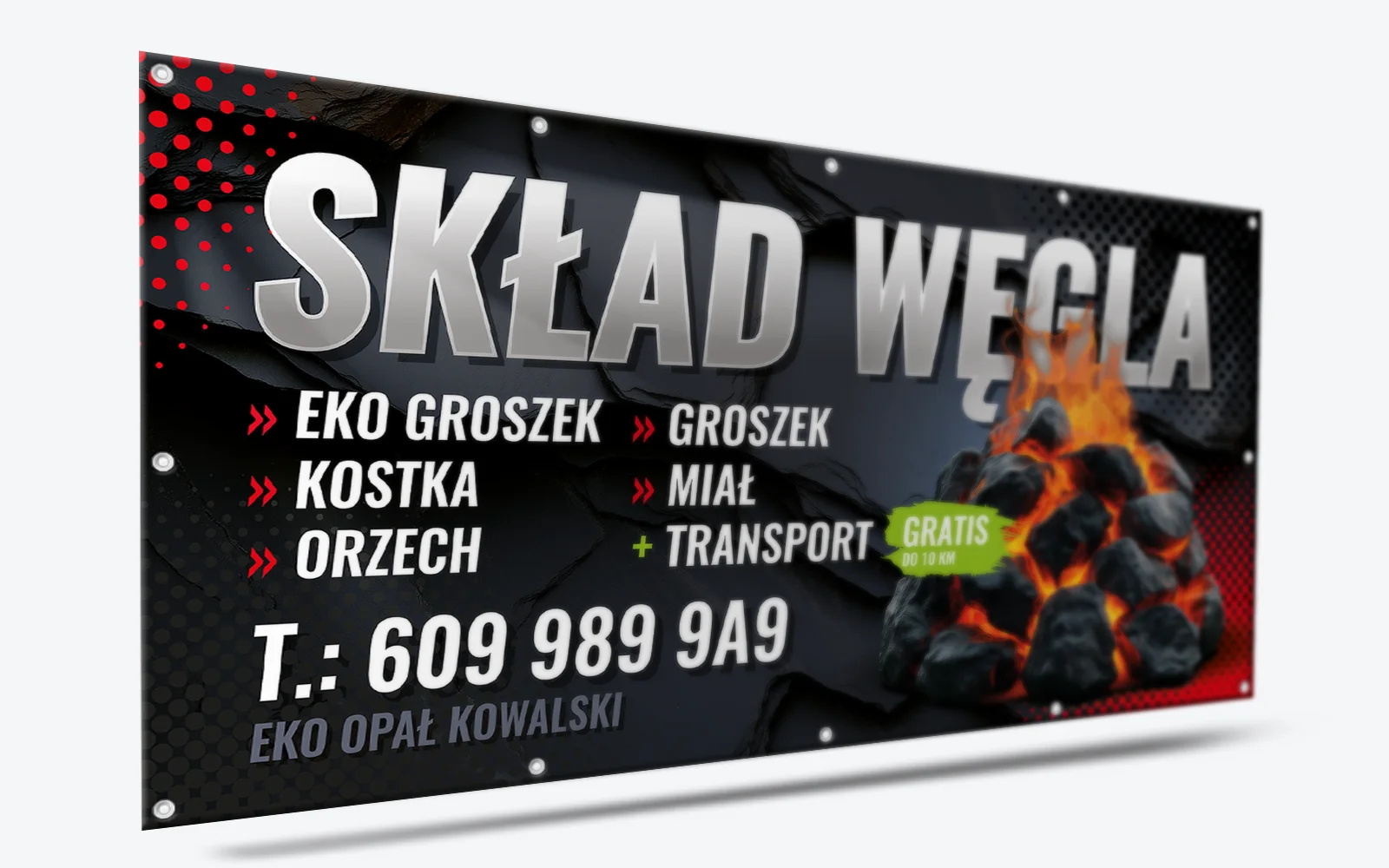Prezentowany baner reklamowy to wysokiej jakości produkt, który został zaprojektowany specjalnie z myślą o firmach zajmujących się sprzedażą węgla. Atrakcyjny design, czytelna grafika, przemyślane rozmieszczenie informacji oraz dodatkowe korzyści, takie jak darmowy transport, sprawiają, że baner ten jest idealnym narzędziem marketingowym. Dzięki niemu firma może zwiększyć swoją widoczność na rynku, przyciągnąć nowych klientów i zbudować wizerunek solidnego partnera w branży opałowej.
