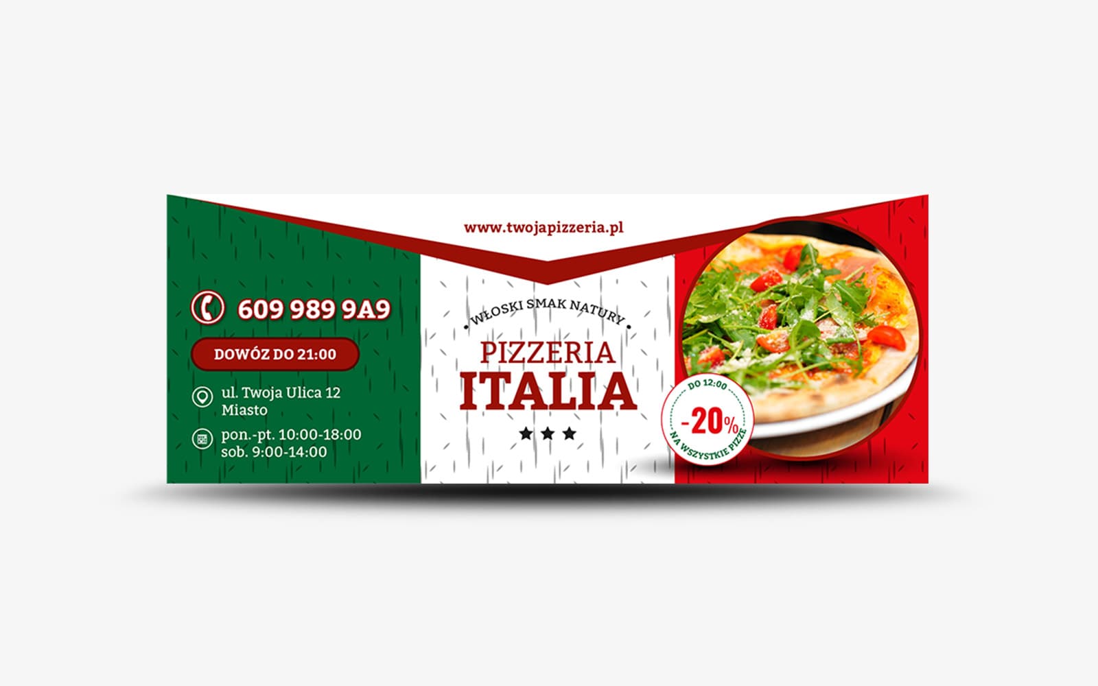 Grafika wyróżnia się mocnym akcentem włoskiej flagi w tle, co od razu nasuwa skojarzenia z tradycyjną, prawdziwą pizzą inspirowaną włoskim klimatem. To szczególnie ważne dla klientów, którzy poszukują autentycznych włoskich dań i klimatu. Ten element grafiki dodaje też charakteru i wyjątkowości całemu designowi covera.