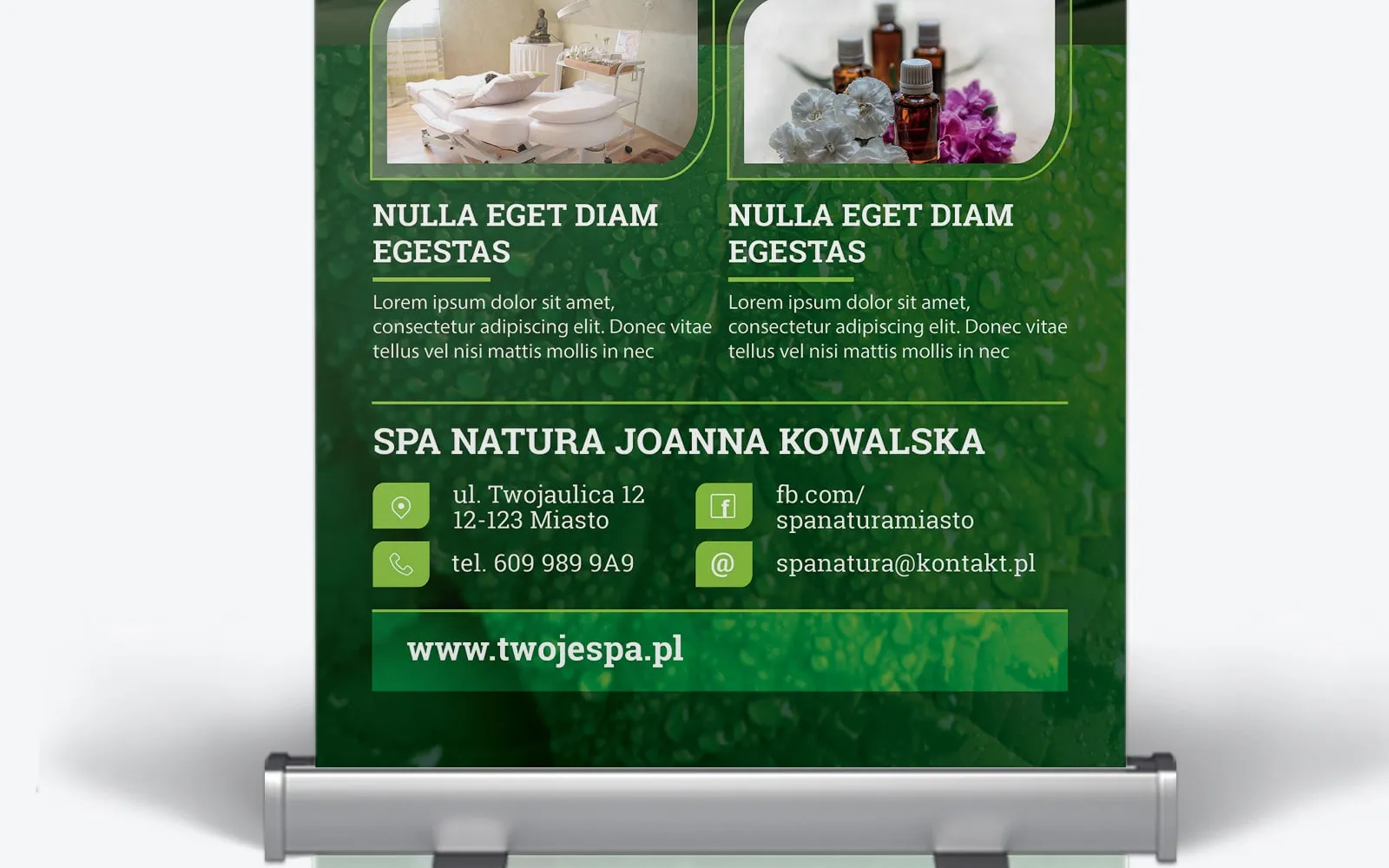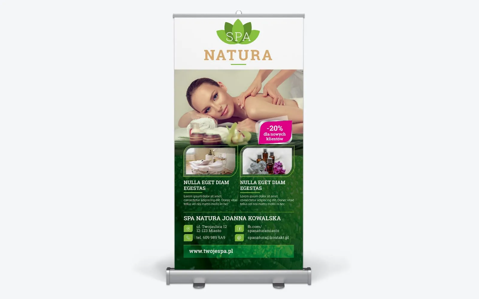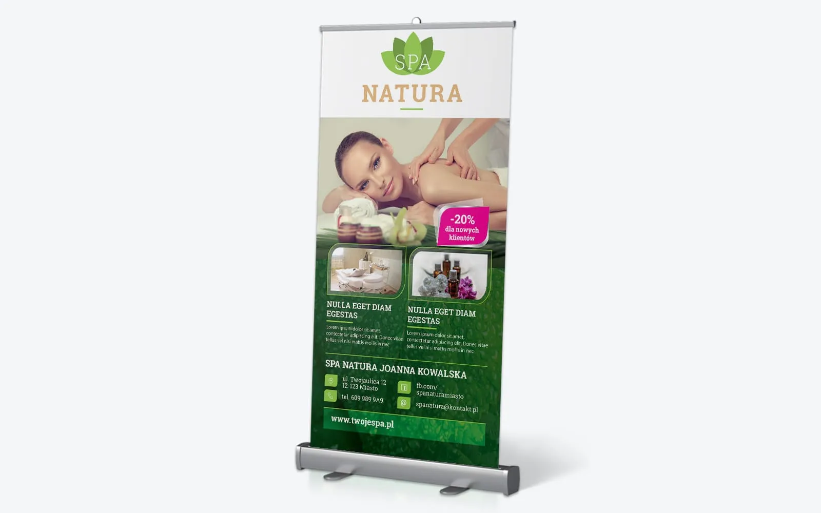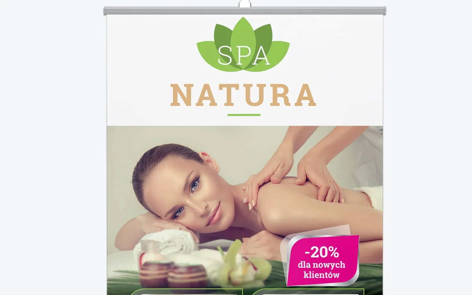 Napisz pierwszą opinię o „Projekt graficzny roll upa dla salonu spa z tłem zielonego liścia”