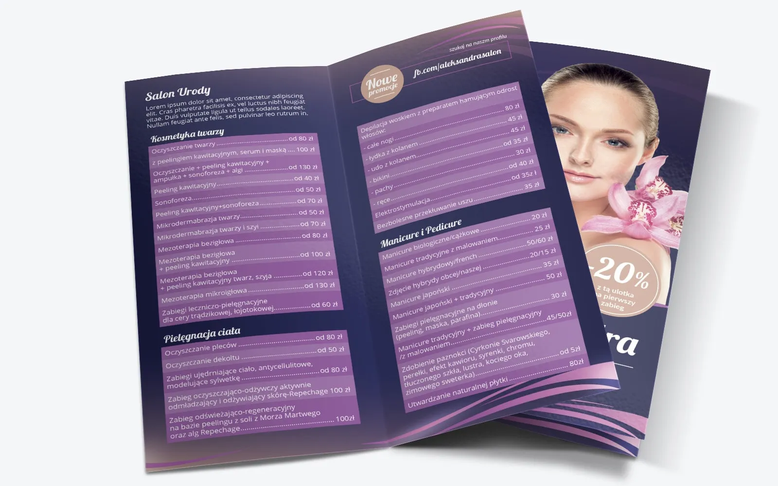 Ulotka dla salonu kosmetycznego, składana z cennikiem