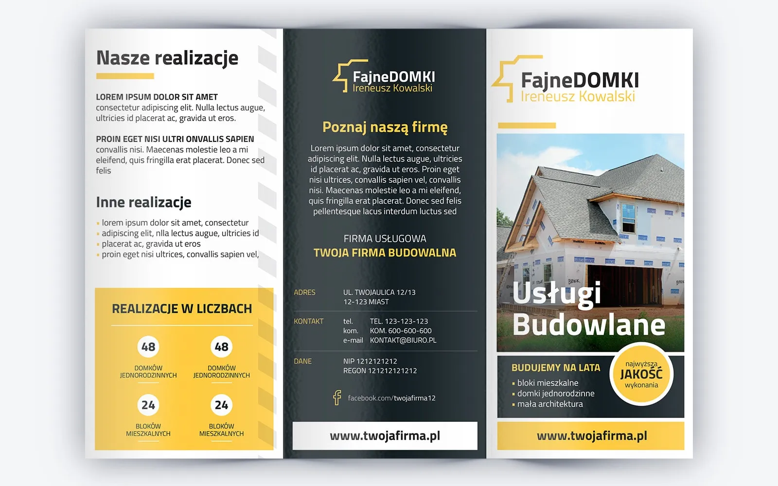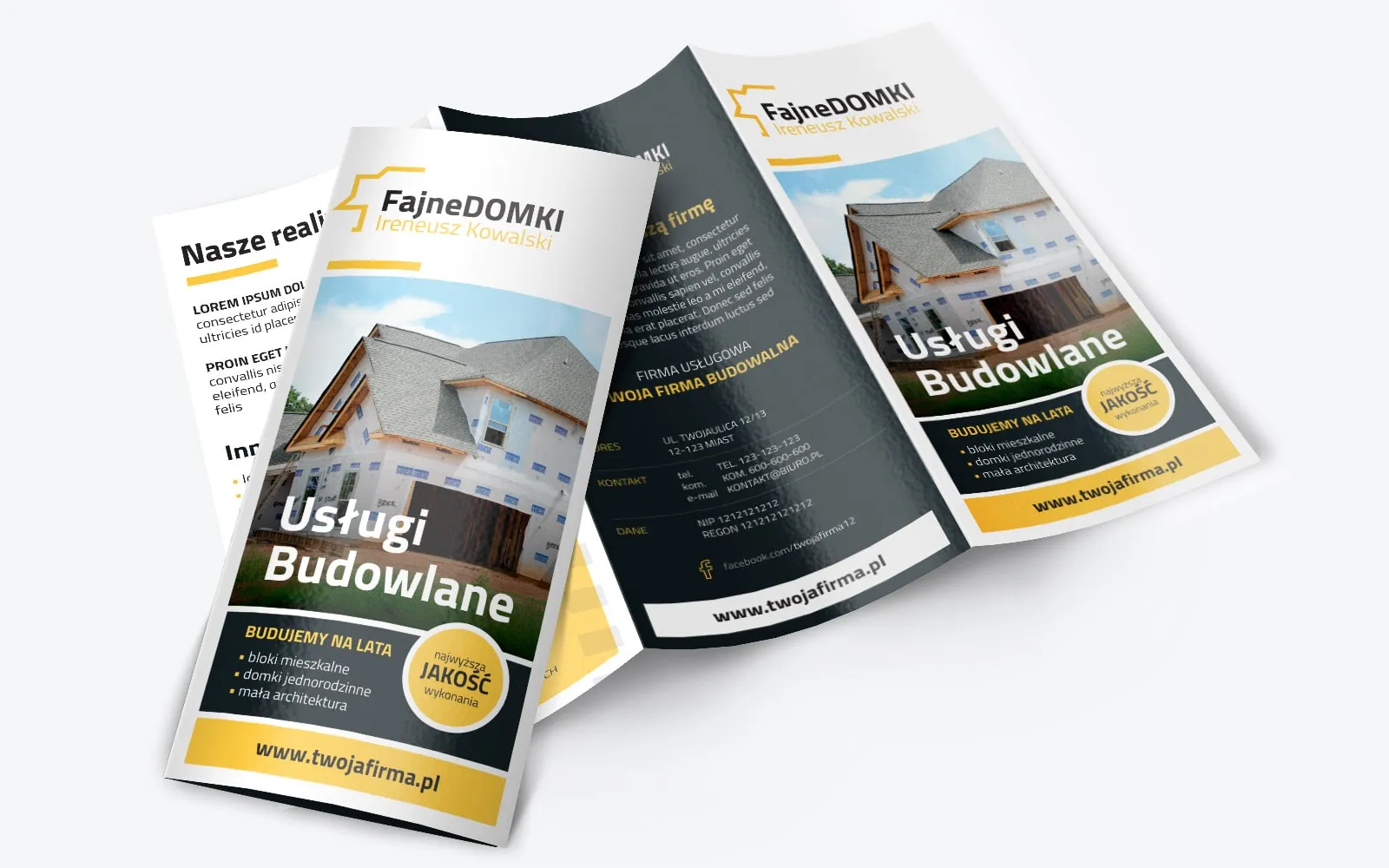 Pozostałe strony ulotki budowlanej to szereg ważnych danych o firmie. Mogą to być szczegóły oferty i przykładowe realizacje. Można do niech dołączyć zdjęcia własnych realizacji z placu realizacji. Na projekcie ulotki przewidziane jest miejsce na statystki, które z pewnością będą interesowały potencjalnych klientów. Ostatnia strona to standardowo kilka słów do odbiorcy. Zachęcają one do skorzystania z usług. Ponadto nie mogło zabraknąć kompletu danych teleadresowych potrzebnych do nawiązania współpracy.