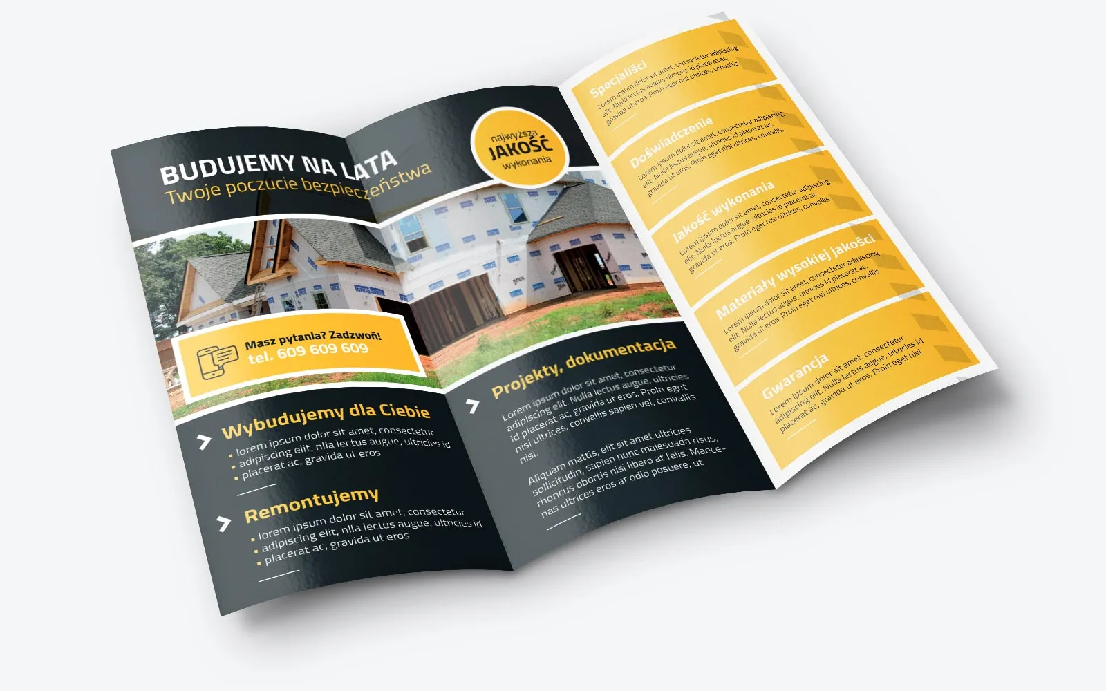 Ulotka dla firmy budowlanej, świadczącej kompleksowe usługi. Zakres działalności może być począwszy od zaprojektowania i wybudowania domu poprzez wykończenia, aż po duże generalne remonty. Dlatego projekt takiej ulotki będzie doskonale służyła np. firmą budowlanym, osobą zajmującym się różnego rodzaju remontami i wykończeniami wnętrz. Wzór może być też interesujący dla biur projektowych i architektonicznych. Firmy te będą mogły z łatwością zapełnić treściami obszary ulotki budowlanej zarówno czysto tekstowymi jak i statystycznymi. Kolorami przewodnimi broszury są biały, żółty oraz grafitowy. Trzy kolory które są bardzo często stosowane w tej branży. W szczególności kolor żółty jest bardzo rozpoznawalny ponieważ nawiązuje do kolorów ostrzegawczych, też maszyny i narzędzia budowlane są znaczone takim kolorem.