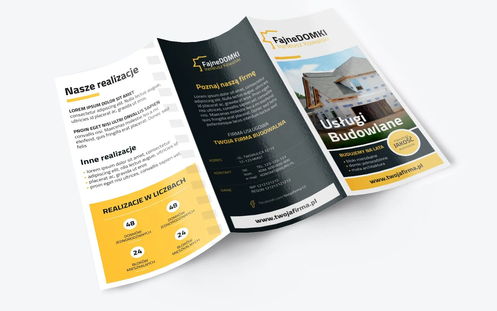 Projekt składanej trójdzielnej ulotki remontowo-budowlanej można dowolnie dostosować do wymagań. Na Twoje potrzeby możemy zmienić kolory, fonty, układ graficzny jak i podmienić zdjęcia na podesłane. Zapoznaj się również z innymi projektami graficznymi.