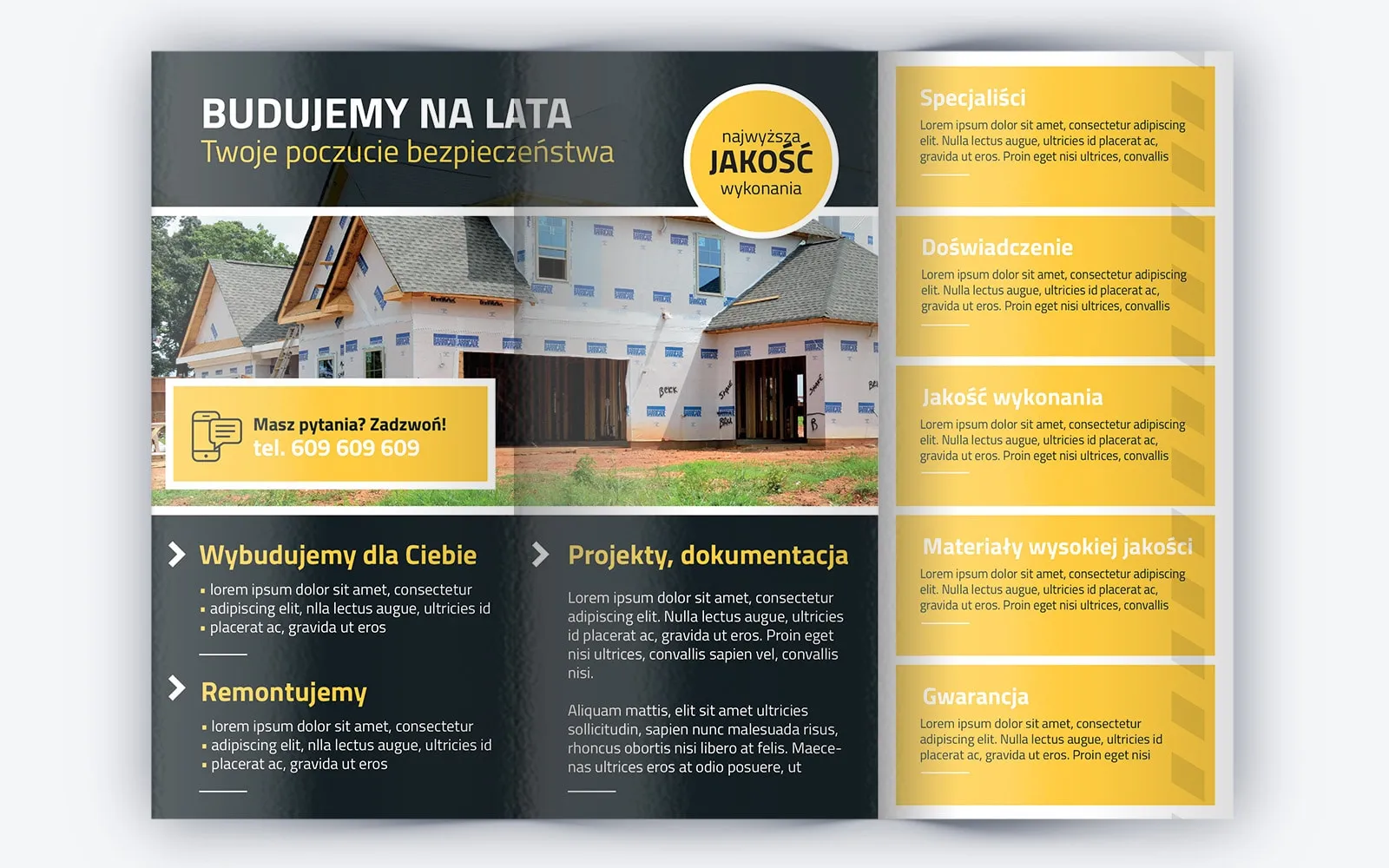 Ulotka remontowa została zaprojektowana w czarno-żółtej kolorystyce, z wieloma elementami graficznymi. Niektórymi z nich są ramki, które sprawiają, że zawarte w niej informacje reklamowe są czytelne i wyraziście ulokowane. Pierwsza strona szablonu zawiera na górze logo w postaci domku z wkomponowaną nazwą firmy oraz duże zdjęcie tematyczne budynku w stanie surowym zamkniętym. Pod spodem zaplanowano miejsce na hasło reklamowe, w tym przypadku to „Usługi budowlane”. Niżej znajduje się wypunktowane trzy najważniejsze nisze firmy czyli np. budowa boków, budowa domków jednorodzinnych, budowa małej architektury.