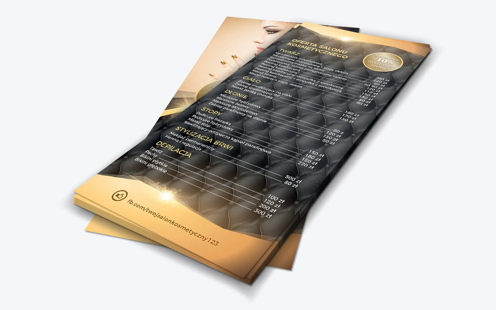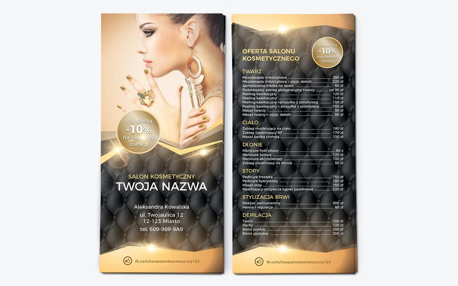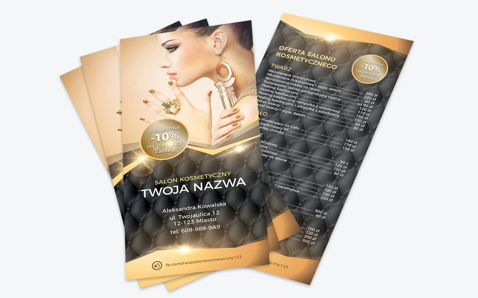 Szyk i klasa wyróżniają ten gotowy szablon ulotki na tle innych. Wzrok odbiorcy błyskawicznie przykuwa nietuzinkowy motyw czarnej pikowanej skóry, który został zastosowany w tle projektu. Idealne współgra on ze złotymi akcentami w postaci napisów i okrągłych pól do wpisania rabatu. Budzący skojarzenia z luksusem projekt sugeruje wysoką jakość usług, z których skorzystać mogą klientki salonu. Na przedniej stronie ulotki uwagę zwraca umieszczone na niej wysokiej jakości zdjęcie. Grafika przedstawia zjawiskową kobietę, z wieczorowym makijażem i błyszczącą stylizacją paznokci. Na pikowanym tle zlokalizowane zostały napisy: salon kosmetyczny, jego pełna nazwa, adres oraz numer kontaktowy. Pod spodem widnieje link do profilu na FB, gdzie klientki mogą zapoznać się z pełną ofertą salonu i zobaczyć realizowane przez niego usługi. Widoczne jest także okrągłe pole z informacją o zniżce dla posiadaczy ulotki. Na odwrocie powtórzono motyw pikowanej skóry, na której wyszczególniono ofertę salonu. Zabiegi, podzielone na kategorie, opatrzone zostały opisami i cenami. Powtórzono także informację o promocyjnej cenie pierwszego zabiegu. Na dole, tak jak na poprzedniej stronie, znaleźć można link do FB salonu.