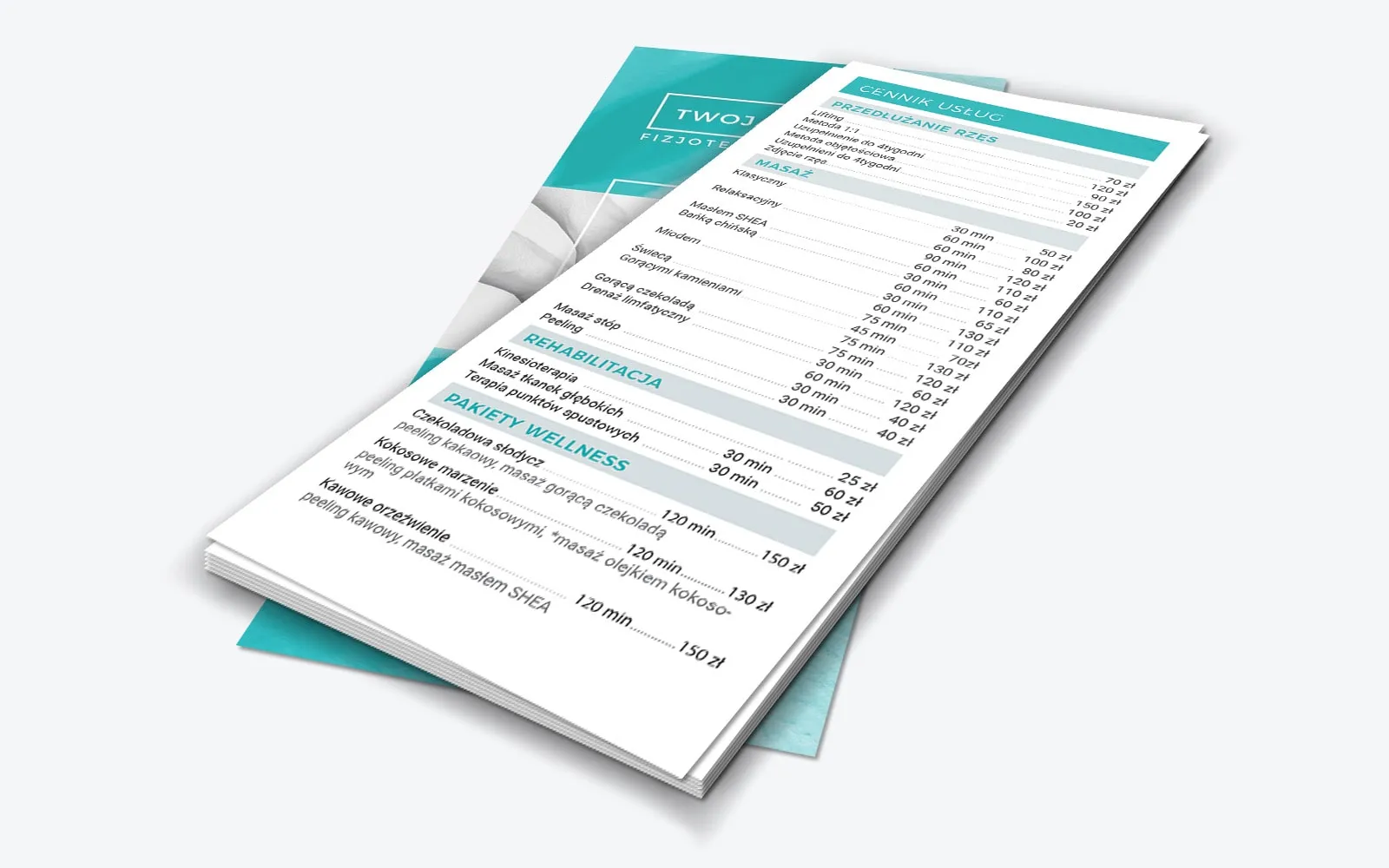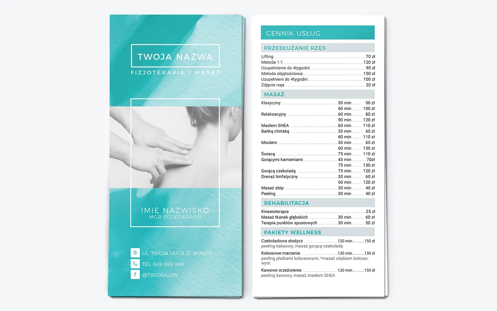 Gustowna dwustronna ulotka przyciąga uwagę nietuzinkową kolorystyką. Wykorzystany w projekcie turkus wykazuje działanie uspokajające i kojące zmysły. Dzięki temu tak doskonale sprawdzi się w działalności fizjoterapeutów. Z powodzeniem wprowadza ich klientów w relaksujący nastrój, jaki towarzyszy masażom leczniczym i zabiegom rehabilitacyjnym. Przestrzeń na frontowej stronie to cieniowanie turkusowe tło, na środku którego umieszczona została wysokiej jakości fotografia. Ukazuje ona fizjoterapeutę w pracy, przynoszącego ulgę obolałym plecom pacjenta. Na górze strony znalazła się nazwa gabinetu wraz z delikatnym obramowaniem. Ramka przechodząca przez zdjęcie zawiera z kolei imię i nazwisko terapeuty wraz z tytułem magistra fizjoterapii. Poniżej znalazły się natomiast oznaczone ikonami: adres gabinetu, telefon do umawiania spotkań oraz link do FB. Przestrzeń na odwrocie dwustronnej ulotki utrzymana jest w bieli, co zapewnia świetną czytelność tekstu. Wykorzystano jednak współgrające z frontem turkusowe detale. Cennik usług podzielono na kategorie, a poszczególne pozycje opatrzono ceną i opcjonalnie czasem trwania zabiegu. Taki układ usprawnia wyszukiwanie konkretnych zabiegów. Przykładowe pozycje na ulotce wraz z opisami mogą wyglądać następująco: