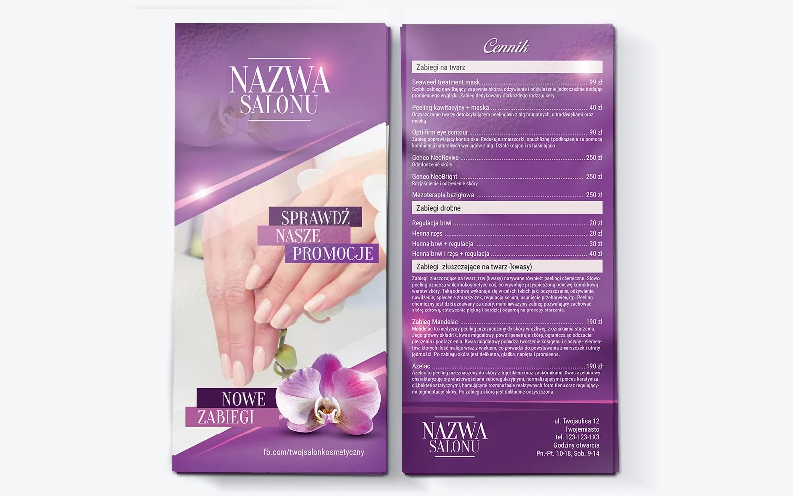 Na odwrocie broszury zaprojektowano powierzchnię na cennik usług kosmetycznych z podgrupami zabiegów oraz zabiegami i ich opisami. Poniżej na projekcie ulotki znajduje się miejsce na dane teleadresowe i logo gabinetu. Ulotka z cennikiem to doskonałe narzędzie do przedstawienia pełnej oferty salonu w zorganizowany i estetyczny sposób. Klarowne podgrupowanie usług ułatwia klientkom wybór odpowiedniego zabiegu, co może przyspieszyć decyzję o wizycie.