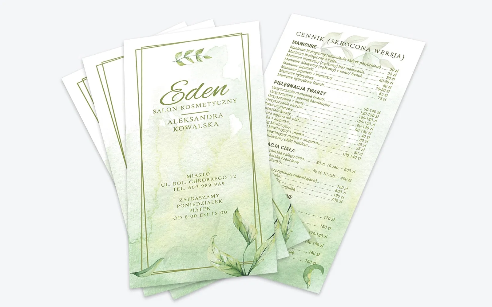 Projekt ulotki z motywem zielonych listków i w technice akwareli stanowi świetną formę promocji firm branży kosmetycznej. By w pełni dostosować się do charakteru działalności klienta, proponujemy swobodną personalizację wzoru prostej i czytelnej ulotki w formacie DL (90×210 mm) pod względem umieszczonej na niej treści. W ramach kompleksowej usługi projektujemy i drukujemy dostępny szablon na wysokiej jakości papierze. Doskonałym jej uzupełnieniem będą wizytówka i voucher podarunkowy, dostępne w powiązanych produktach.