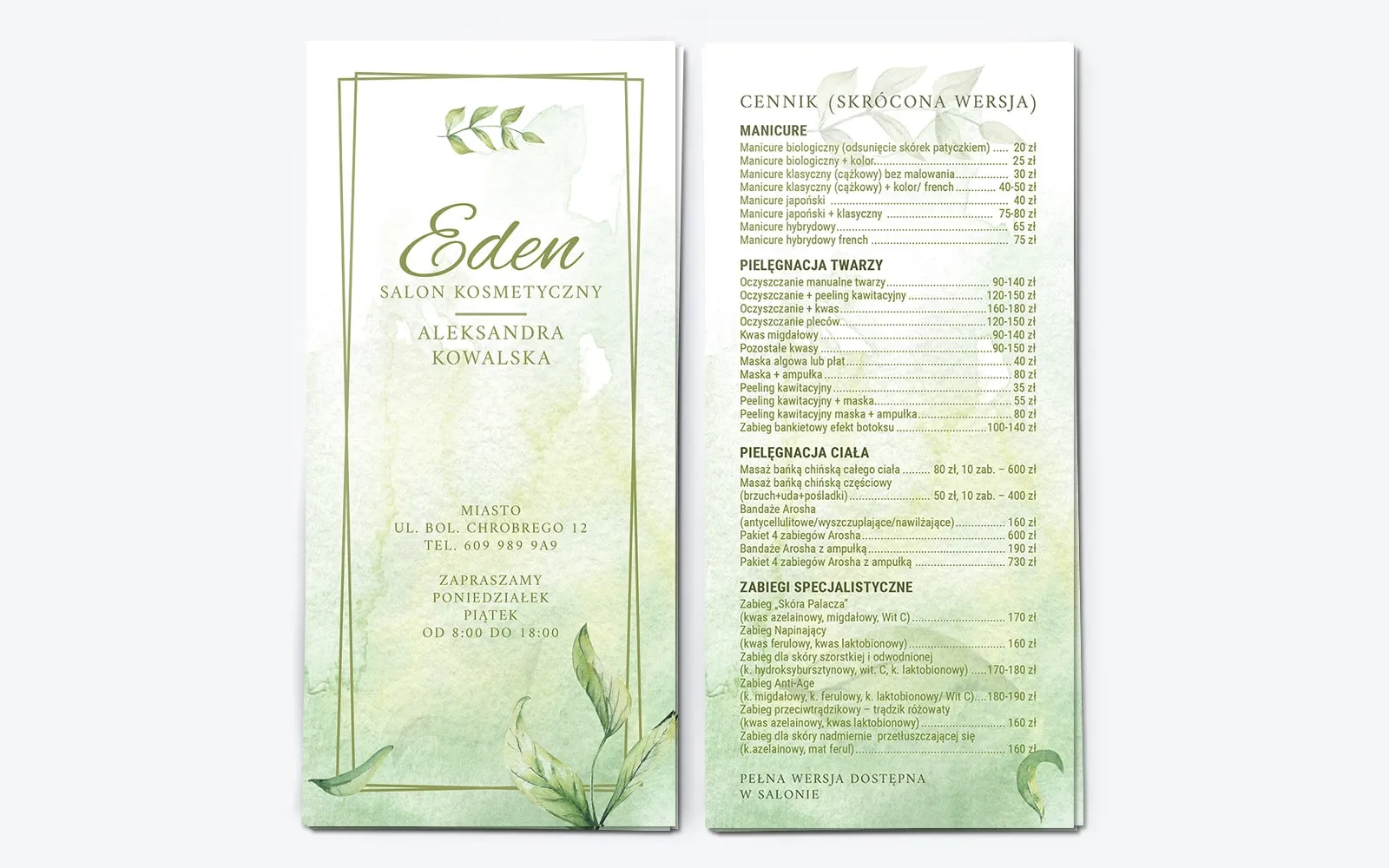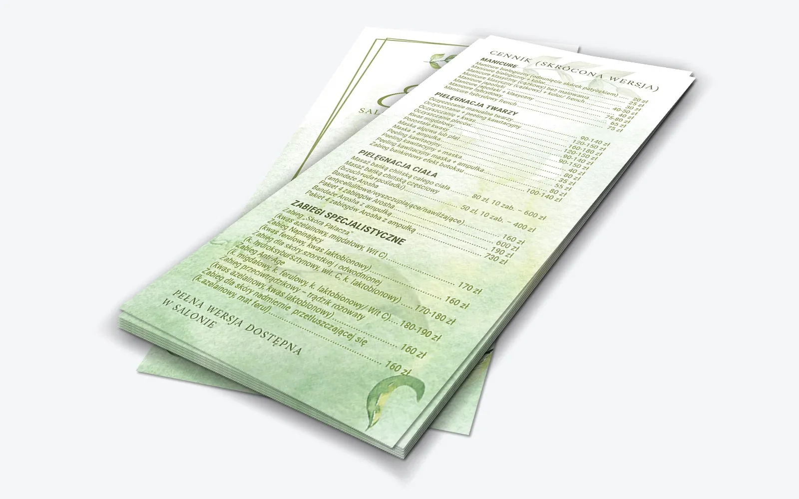 Delikatny projekt dwustronnej ulotki to odpowiedź na potrzeby miłośników motywów roślinnych, cieszących się niesłabnącą popularnością. Na przedniej stronie ulotki, za pomocą podwójnego obramowania, wydzielona została przestrzeń na nazwę firmy i jej dane teleadresowe wraz z godzinami otwarcia. Przestrzeń na odwrocie poświęcona jest skróconemu cennikowi salonu. Kluczowe zabiegi podzielone zostały na kategorie, takie jak manicure, pielęgnacja twarzy, zabiegi specjalistyczne i inne. Obok nazwy zabiegi widnieje jego cena. Pod spodem umieszczona została informacja o tym, że pełna lista zabiegów z cenami dostępna jest w salonie. Oryginalne tło w postaci plam farb akwarelowych nadaje ulotce wyjątkowo uniwersalny charakter.