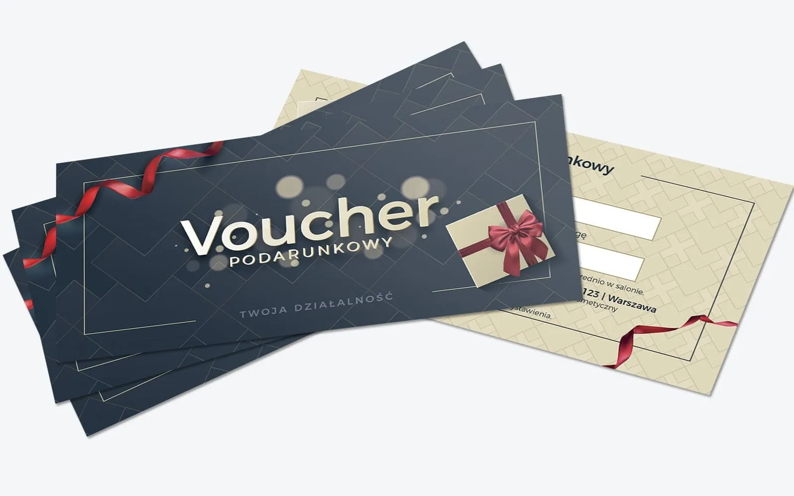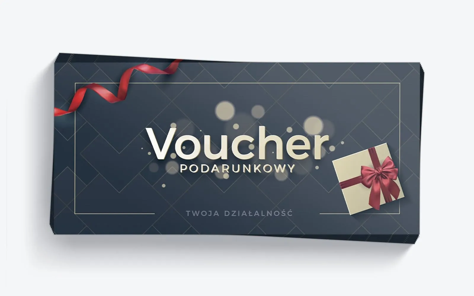 Voucher charakteryzuje się eleganckim ciemnym tłem, ozdobionym subtelnymi geometrycznymi wzorami, które podkreślają ekskluzywny charakter prezentu. Dodatkowo, świąteczny element w postaci czerwonej wstążki i drobnych, złotych akcentów idealnie wpisuje się w klimat świątecznej magii. Dzięki temu voucher wygląda jak idealny prezent na święta, gotowy do wręczenia pod choinkę.