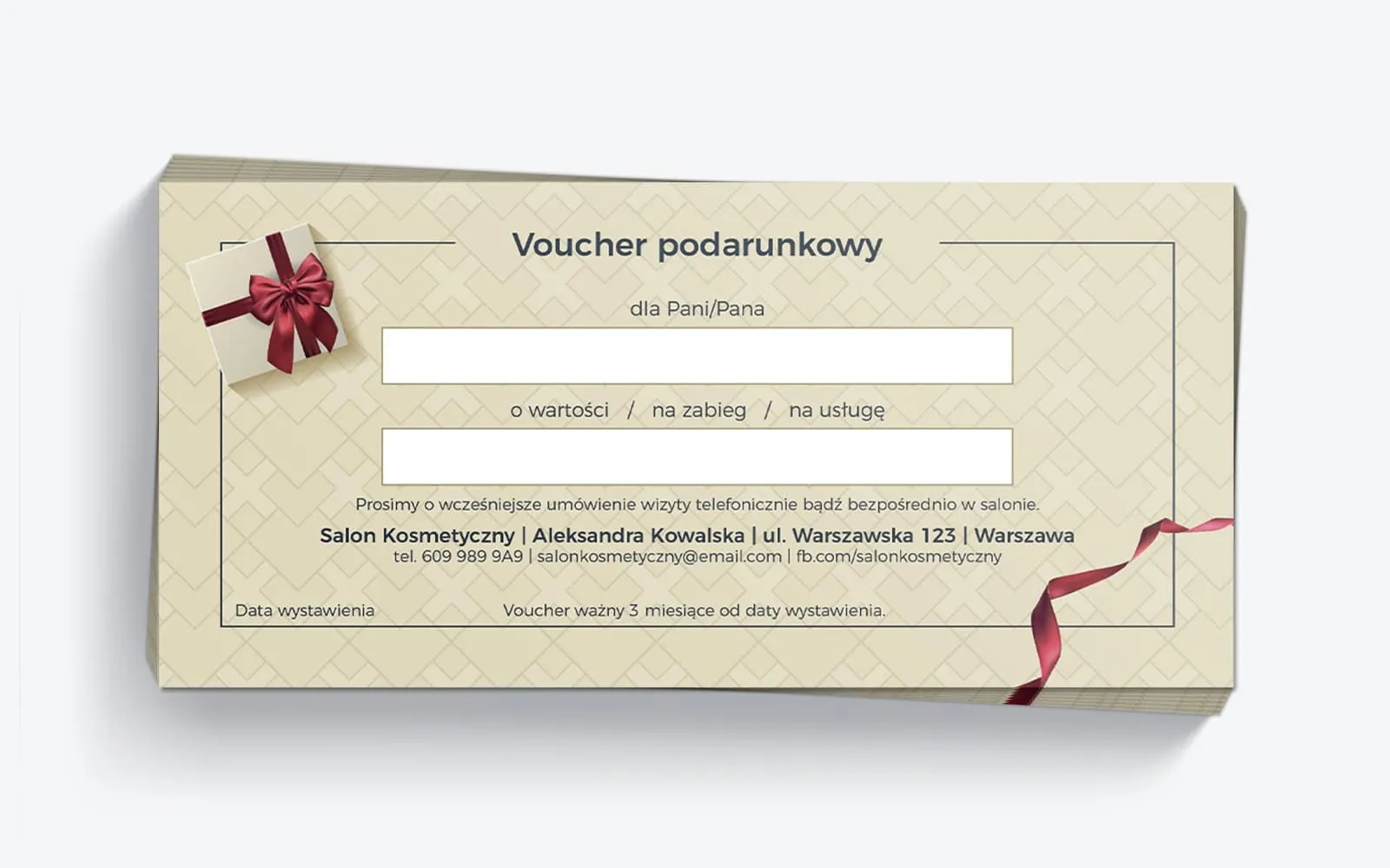 Voucher podarunkowy jest w pełni personalizowany, co pozwala na wpisanie imienia obdarowanej osoby oraz wskazanie konkretnej usługi lub kwoty, jaką obejmuje bon. Na odwrocie znajdują się dane kontaktowe do salonu kosmetycznego, takie jak adres, numer telefonu oraz email, co ułatwia zarezerwowanie wizyty i skorzystanie z oferty w dogodnym terminie. Voucher świąteczny jest ważny przez 3 miesiące, co zapewnia odpowiednią elastyczność.