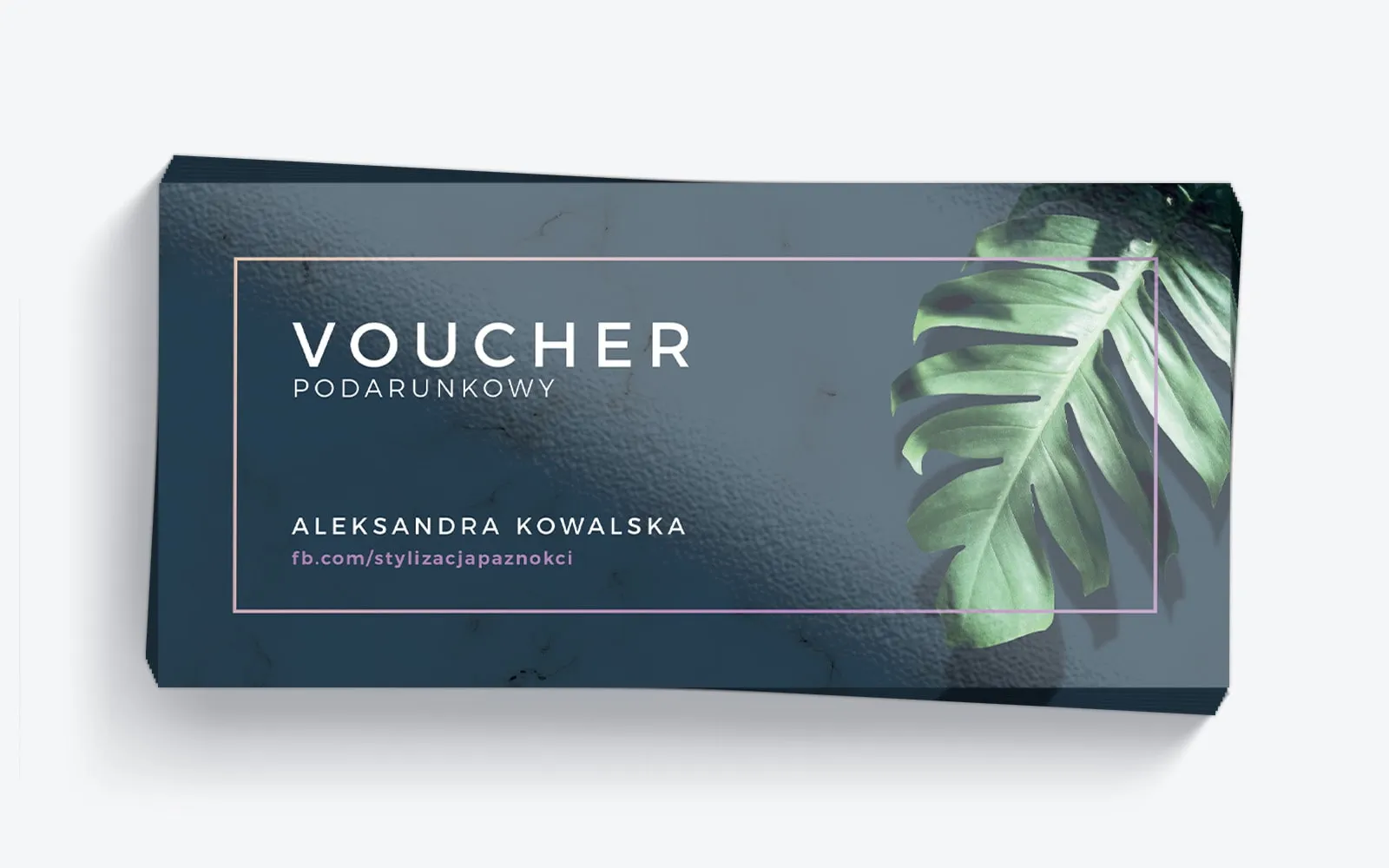 Projekt został wzbogacony o ciekawy akcent graficzny – zielony liść monstery, jednej z najmodniejszych roślin doniczkowych, symbolizującej świeżość i naturę. Liść został umieszczony w prawym górnym rogu, co nadaje voucherowi nowoczesny i modny wygląd. Roślinny motyw doskonale komponuje się z ciemnym tłem oraz pastelowymi odcieniami różu i fioletu, tworząc harmonijną całość.