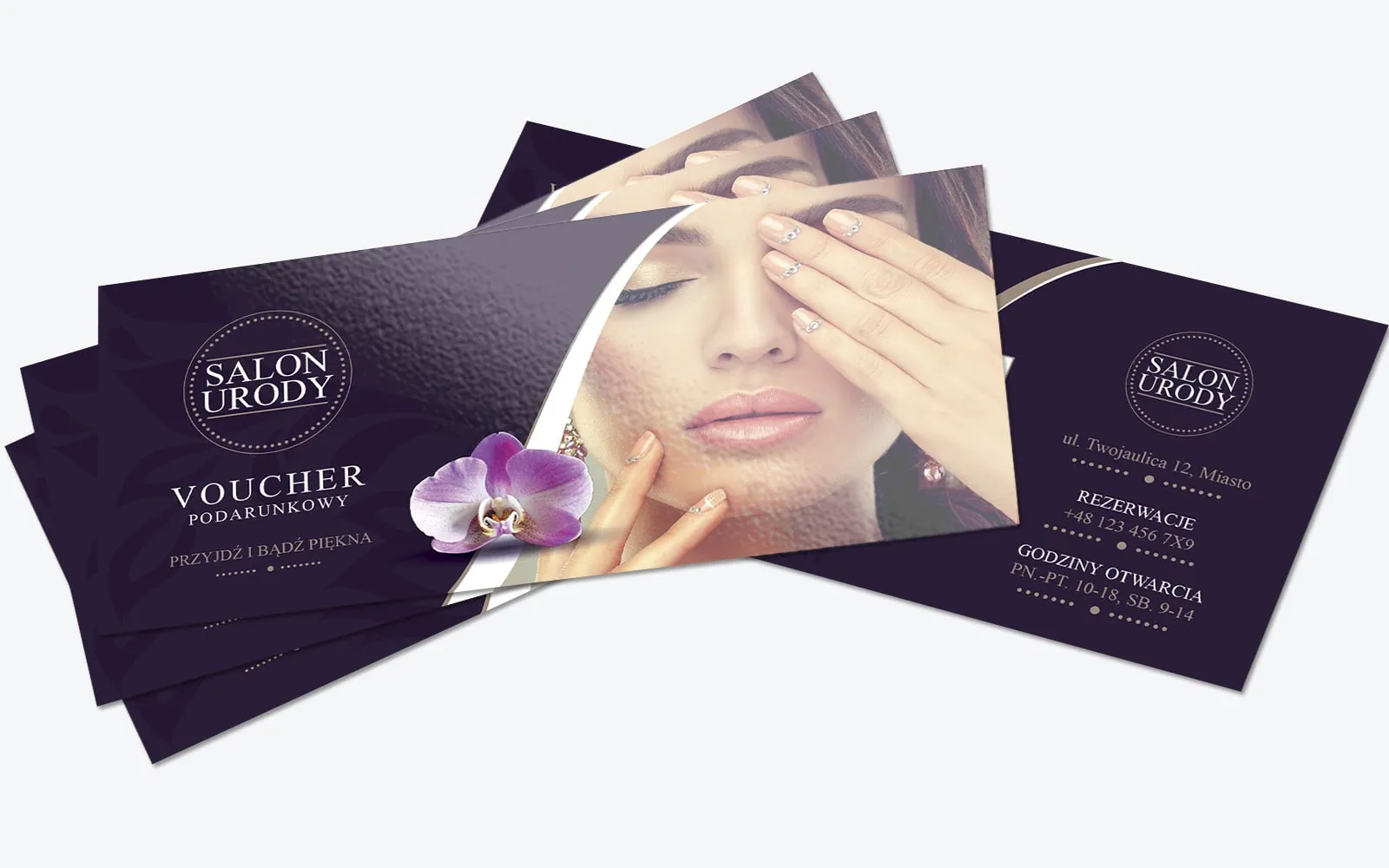 Ciemny fiolet bonu podarunkowego doskonale równoważą subtelne białe i złote akcenty, nadając projektowi ekskluzywnego charakteru. Tym, co jednak przykuwa wzrok w pierwszej kolejności, jest wysokiej jakości zdjęcie kobiety z lśniącymi włosami, nienagannym makijażem i starannie wystylizowanymi paznokciami, co podkreśla profesjonalizm oferowanych usług. Wymowna grafika pełni kluczową rolę, wysyłając potencjalnym klientom sygnał o wysokiej jakości zabiegów wykonywanych w salonie. Pierwsza strona bonu, oprócz sugestywnej grafiki, zawiera logo salonu, ozdobny napis „voucher podarunkowy” oraz hasło reklamowe, które można dostosować do potrzeb salonu. Całość projektu dopełnia kwiatowa grafika, która wprowadza dodatkowy element elegancji. Na odwrocie powtórzono motyw fioletowego tła, w centrum którego znajduje się przestrzeń do wpisania danych posiadacza bonu, takich jak imię i nazwisko oraz wartość zabiegu. Dodatkowo umieszczono miejsce na datę wystawienia bonu oraz warunki korzystania, które obejmują m.in. prośbę o wcześniejszą rezerwację wizyty. U dołu vouchera znalazły się informacje kontaktowe: logo, adres gabinetu, numer telefonu i godziny otwarcia, co ułatwia klientom szybkie znalezienie niezbędnych danych.