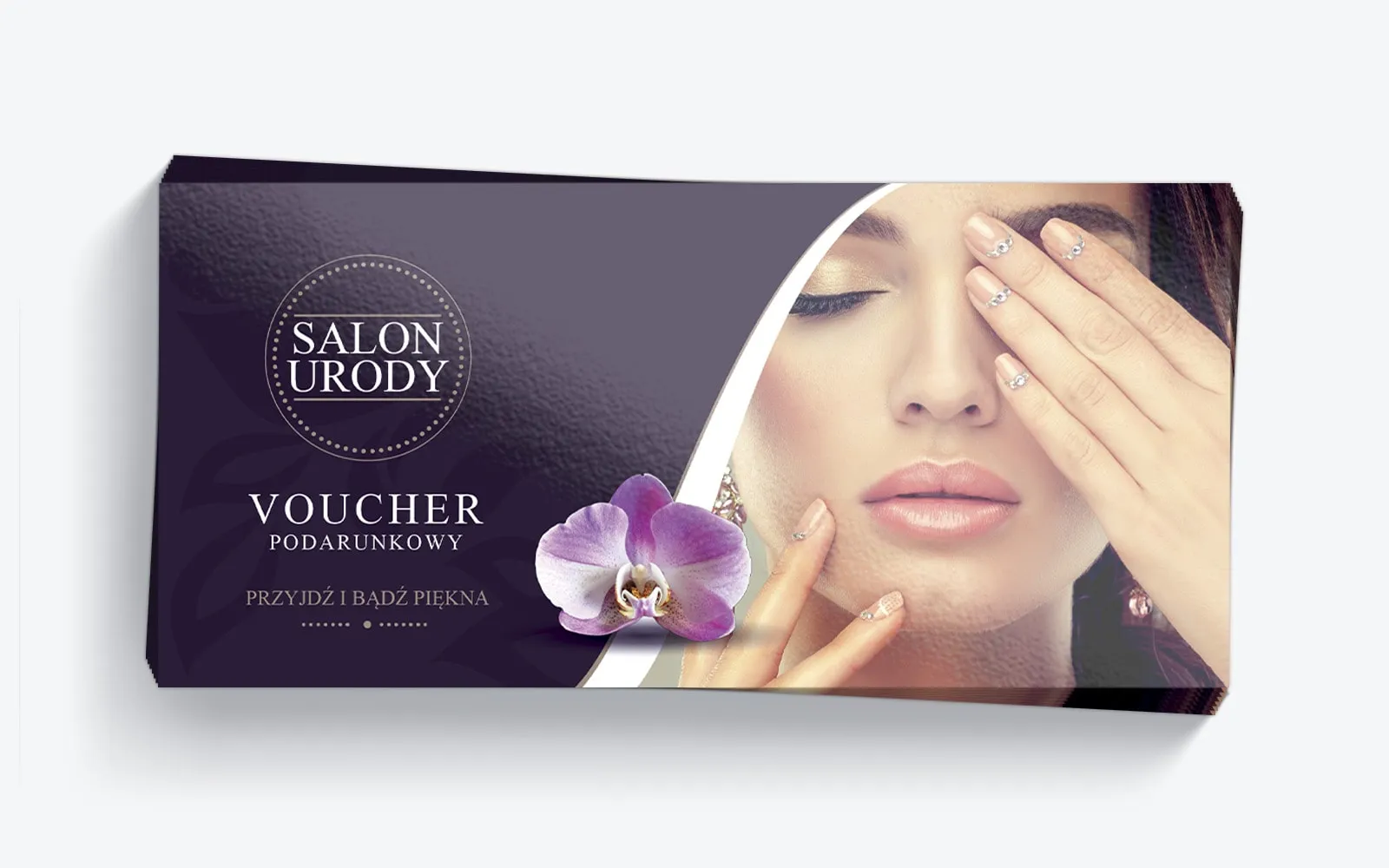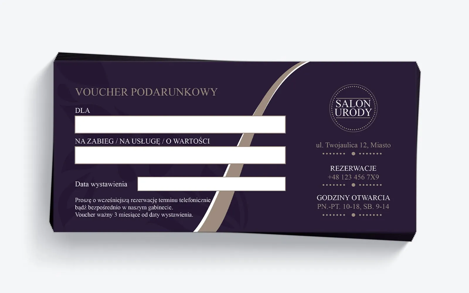 Subtelny, a jednocześnie wyraźny szablon karty podarunkowej został zaprojektowany tak, aby był jak najbardziej uniwersalny i pasował do różnych rodzajów salonów kosmetycznych. Dzięki eleganckiemu i profesjonalnemu designowi, fioletowy voucher podarunkowy stanowi idealną formę promocji zarówno dla salonów urody, jak i gabinetów kosmetycznych. Aby jak najlepiej dopasować się do charakteru działalności salonu, oferujemy możliwość pełnej personalizacji szablonu pod względem treści oraz elementów graficznych. Voucher o wymiarach 99×210 mm może być dowolnie edytowany, aby w pełni spełniał oczekiwania salonu oraz jego klientów. W ramach naszej kompleksowej usługi projektujemy i drukujemy bon podarunkowy na wysokiej jakości papierze kredowym z elegancką grafiką, która podkreśla profesjonalizm i prestiż salonu.
