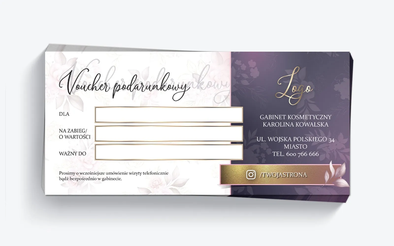 Skuteczność vouchera podarunkowego zależy od jego starannego projektu. Przede wszystkim ważne jest, by idealnie dopasowywał się on do specyfiki danej firmy. W przypadku gabinetów kosmetycznych, fryzjerskich, wizażu czy stylizacji paznokci chodzi przede wszystkim o odpowiednie wkomponowanie kluczowych treści w projekt. Dlatego też proponujemy swobodną personalizację oryginalnego wzoru.