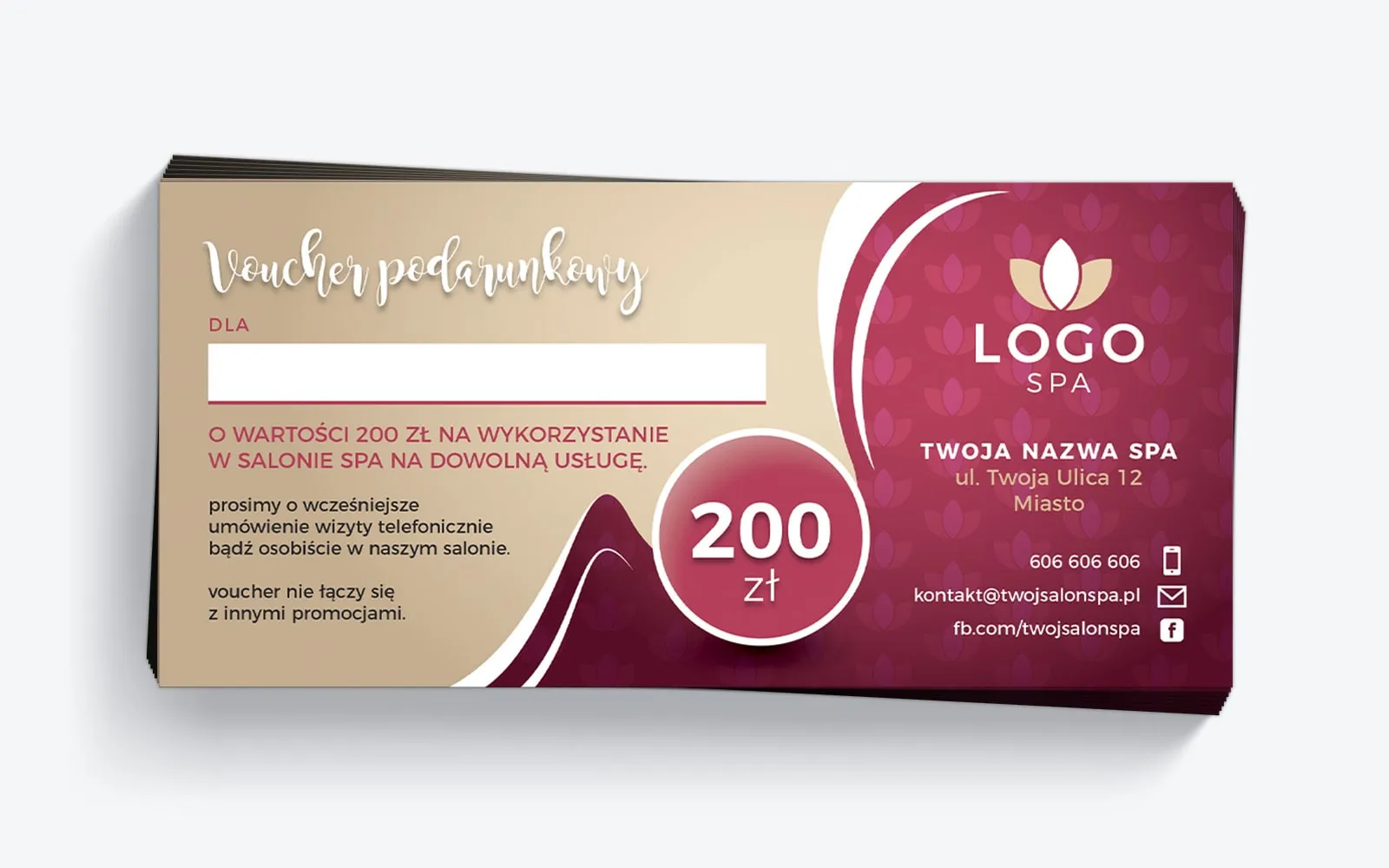 Poszczególne elementy tego wzoru vouchera można dowolnie zmieniać i dostosowywać do potrzeb klienta, co sprawia, że narzędzie to staje się jeszcze bardziej efektywne i dopasowane do konkretnego salonu SPA. Dzięki możliwości personalizacji, voucher ten nie tylko spełnia swoje podstawowe funkcje, ale także staje się potężnym narzędziem promocyjnym, które może pomóc firmom szybko i skutecznie dotrzeć do nowych klientów. Nawet w obecnej formie projekt ten doskonale spełni swoje zadanie i jest idealnym rozwiązaniem dla firm, które pilnie poszukują profesjonalnego i gotowego do użycia projektu vouchera podarunkowego.