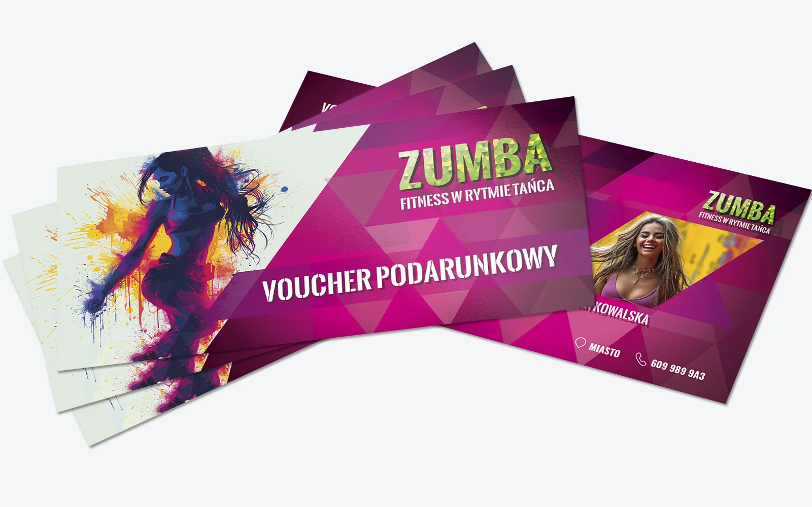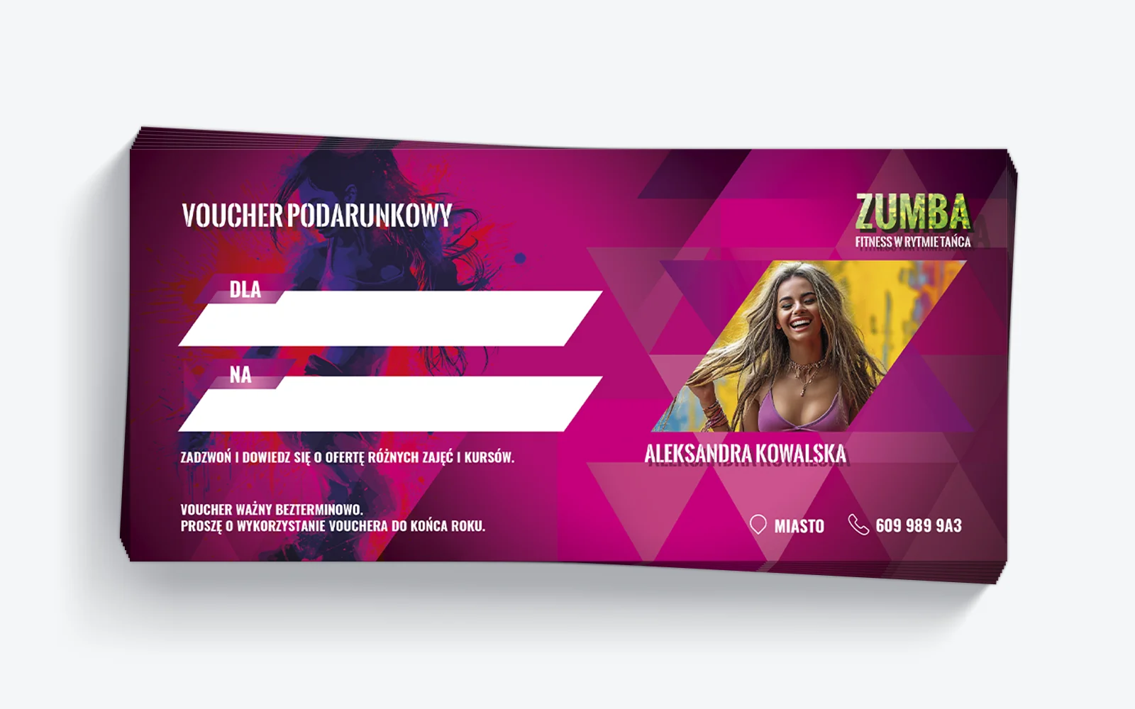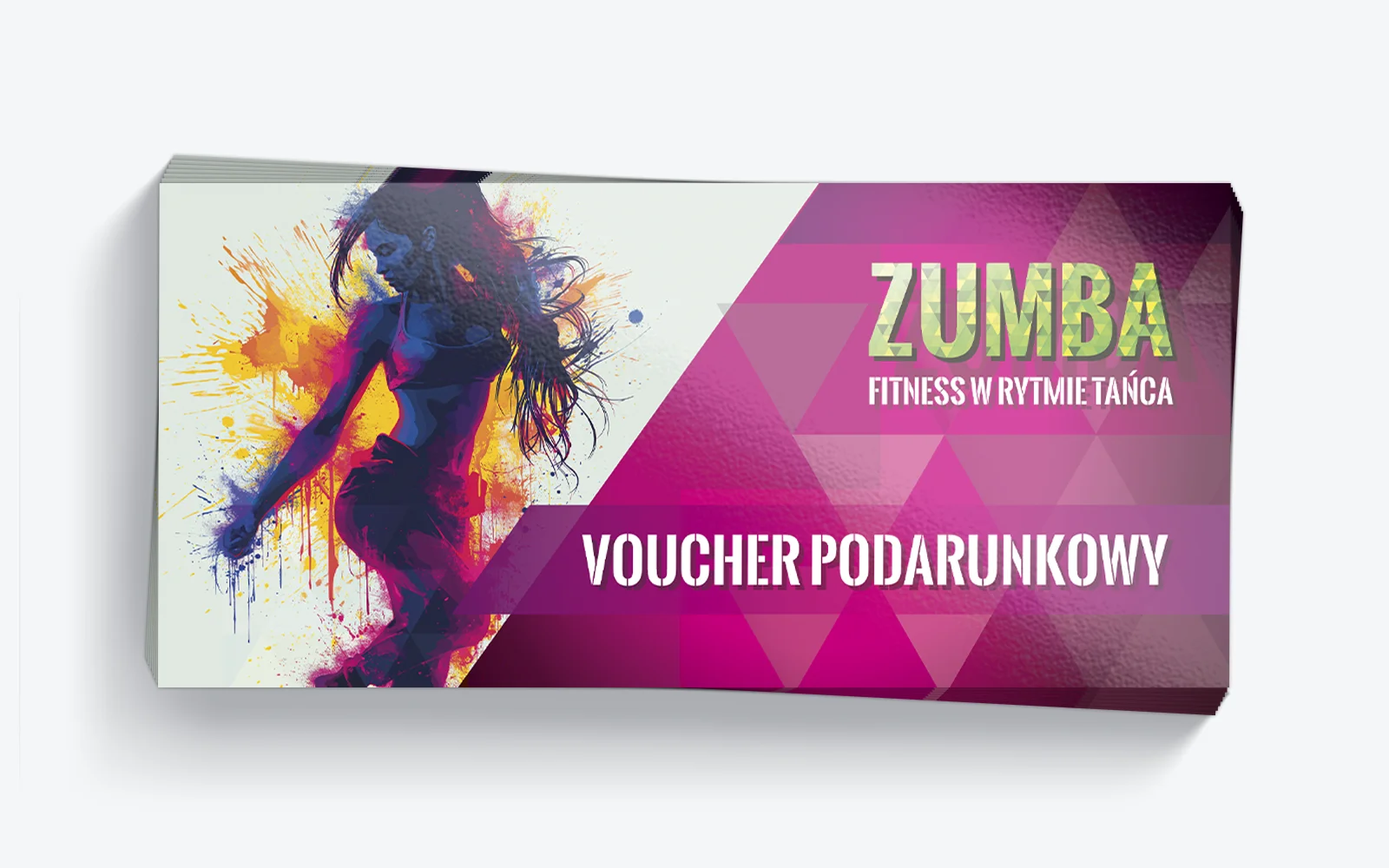 Voucher wyróżnia się nowoczesnym i energetycznym designem, który od razu przyciąga uwagę. Na przodzie vouchera widnieje kolorowa sylwetka tańczącej osoby, która oddaje dynamizm i radość płynącą z zajęć Zumby. Intensywne barwy, takie jak fiolet, róż i żółć, nadają voucherowi żywego i optymistycznego charakteru, zachęcając do skorzystania z oferty.