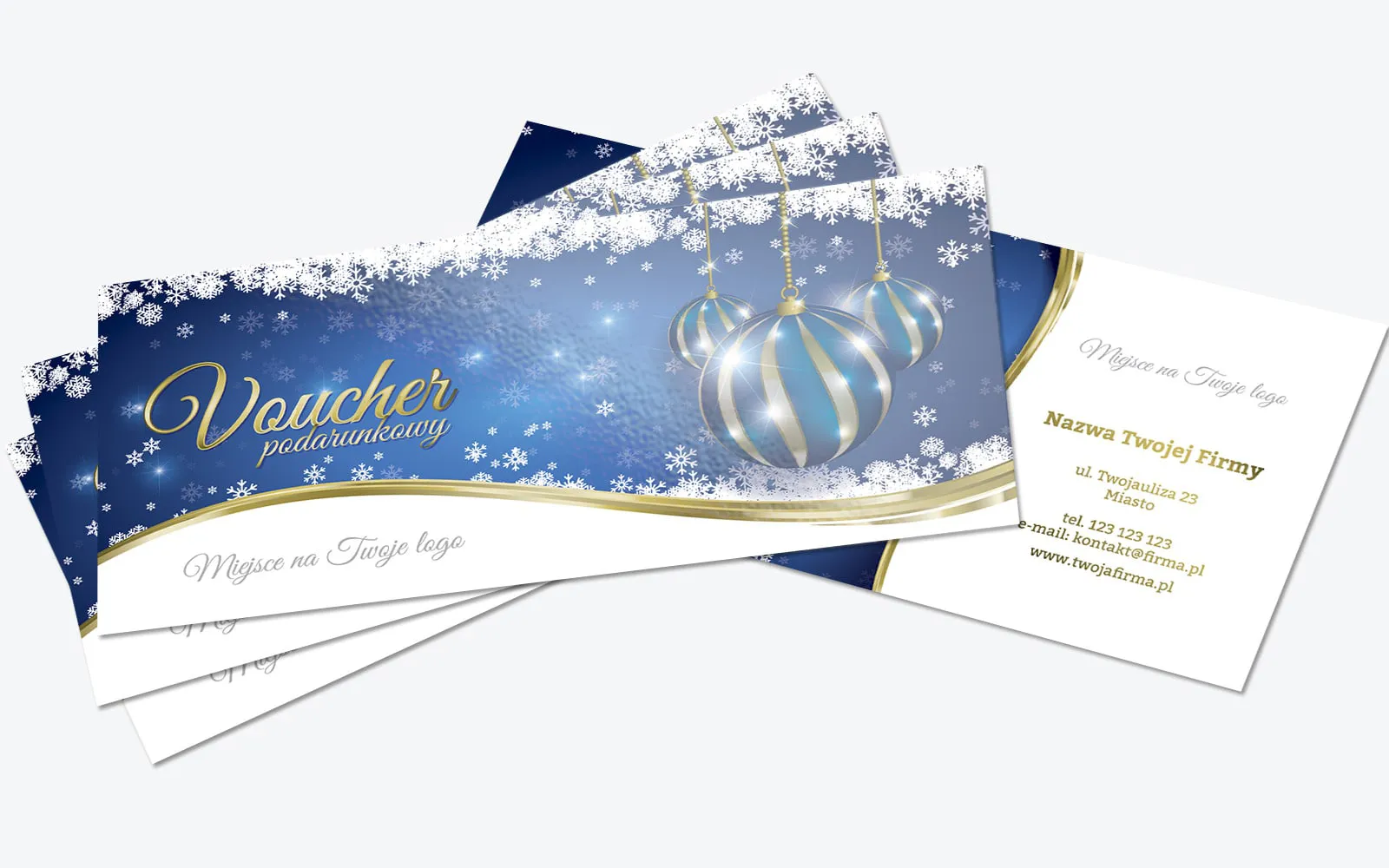 Projekt graficzny świątecznego vouchera w biało-niebieskich barwach