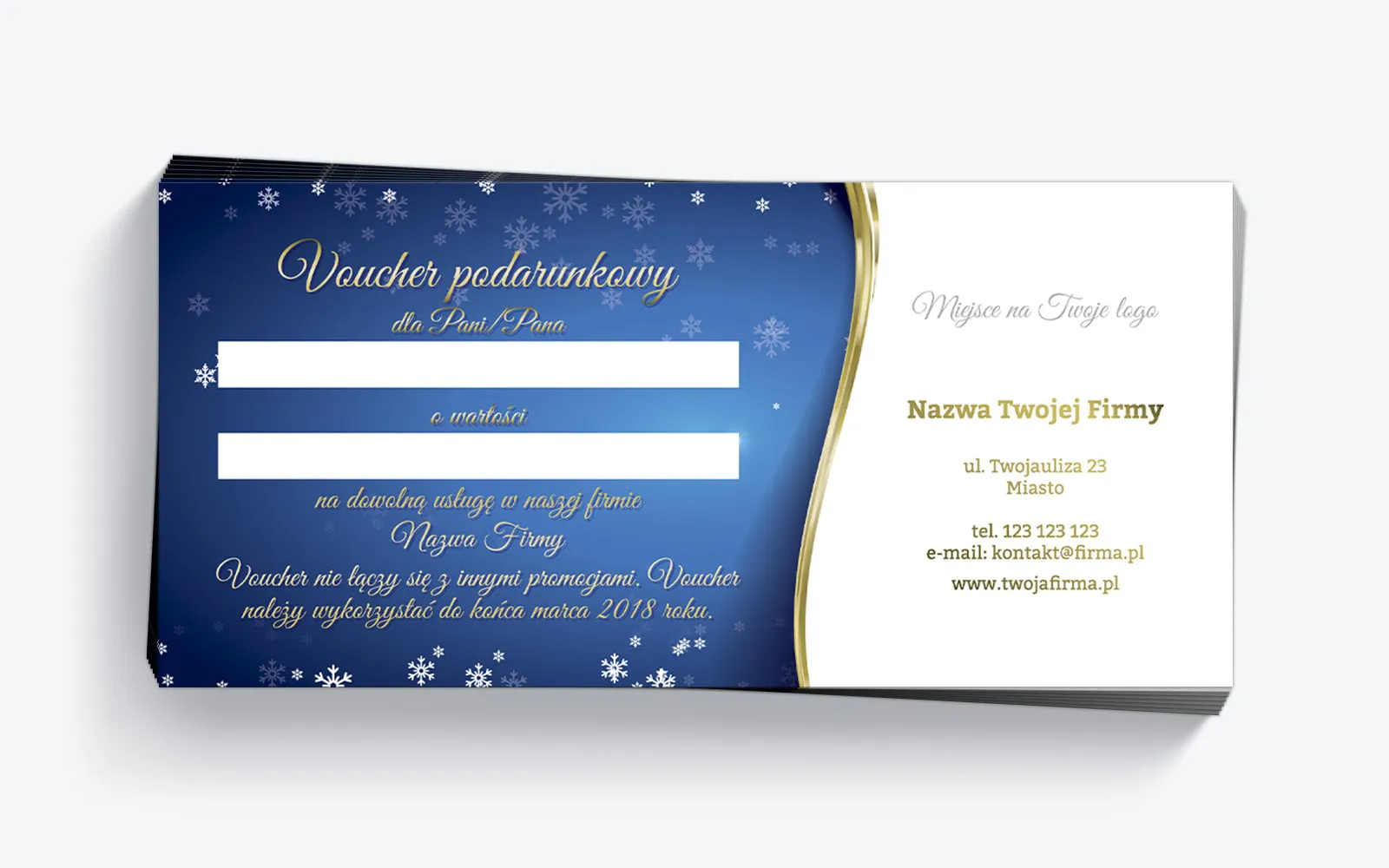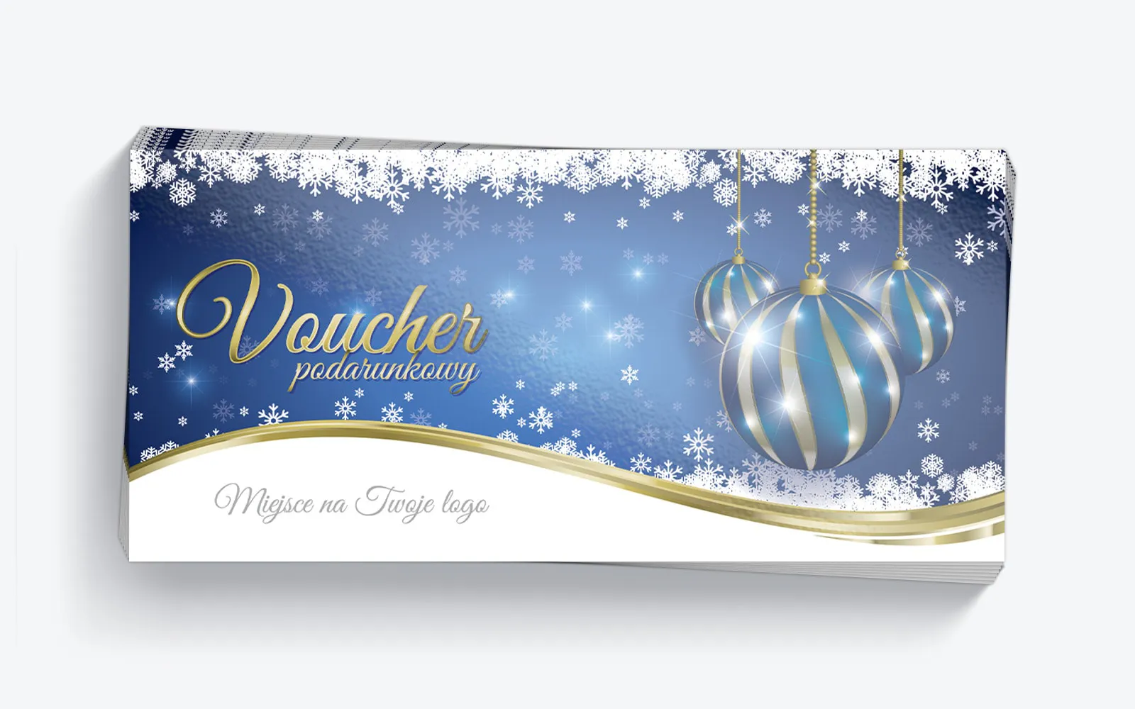 Wyrazisty, biało-niebieski voucher podarunkowy, kojarzący się z zimą i świętami, to uniwersalna propozycja dla firm z różnych branż jako idealny prezent pod choinkę. Ten elegancki voucher doskonale sprawdzi się jako narzędzie promocji sklepów oraz punktów usługowych w okresie grudniowym, kiedy świąteczny klimat sprzyja zakupom. Można go zaproponować klientom jako praktyczny i stylowy pomysł na prezent dla bliskiej osoby. Wybierając voucher z określoną kwotą, obdarowany może samodzielnie zdecydować, w jaki sposób wykorzysta prezent, co czyni go elastycznym i atrakcyjnym rozwiązaniem.