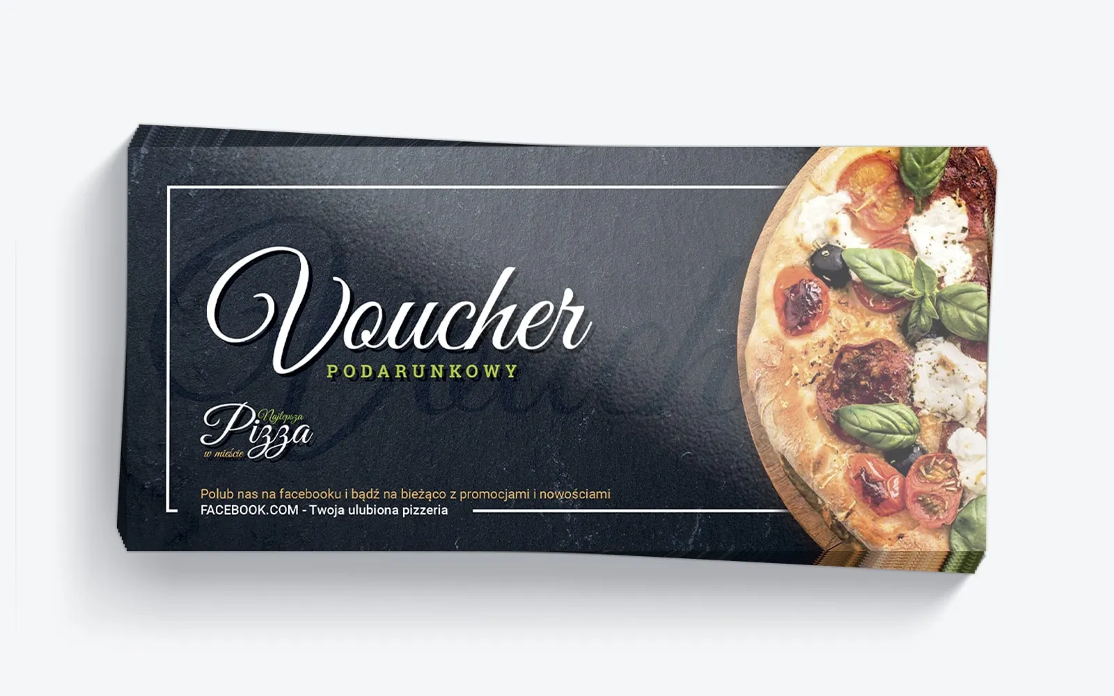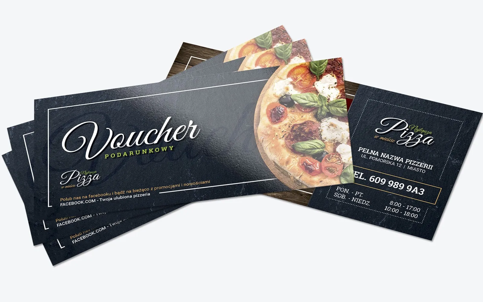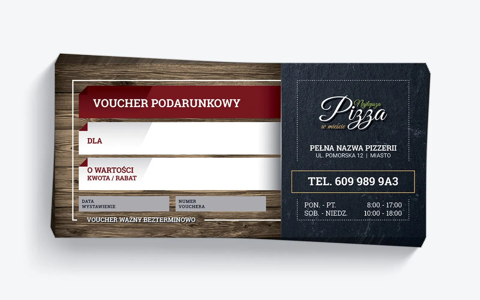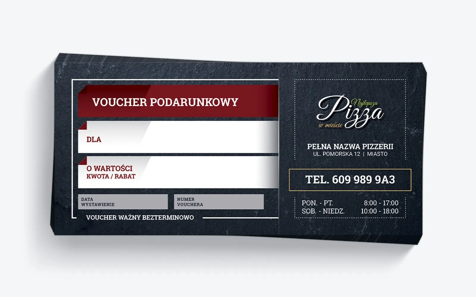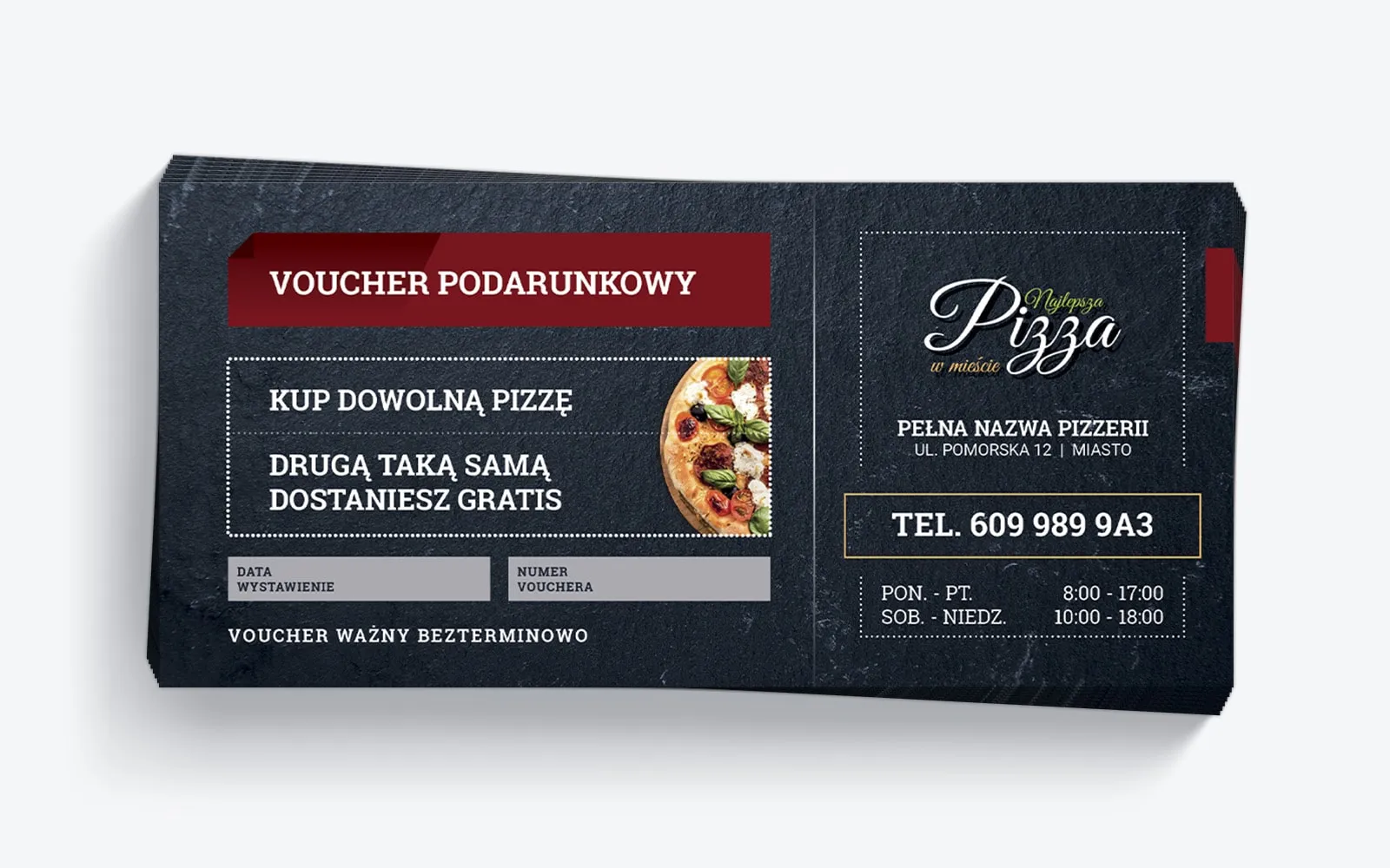 Dwustronny szablon oddziałuje na zmysły i zachęca do skorzystania z oferty lokalu gastronomicznego. By tak się stało, umożliwiamy pełną edycję vouchera rabatowego dla pizzerii. Uniwersalny wzór może być swobodnie edytowany – zarówno pod względem treści, jak rozmieszczenia poszczególnych elementów graficznych. W ramach kompleksowej usługi projektujemy i drukujemy nowoczesny bon podarunkowy na papierze kredowym o wysokiej jakości. Gotowy projekt dostępny jest w praktycznym formacie DL (210×99 mm).