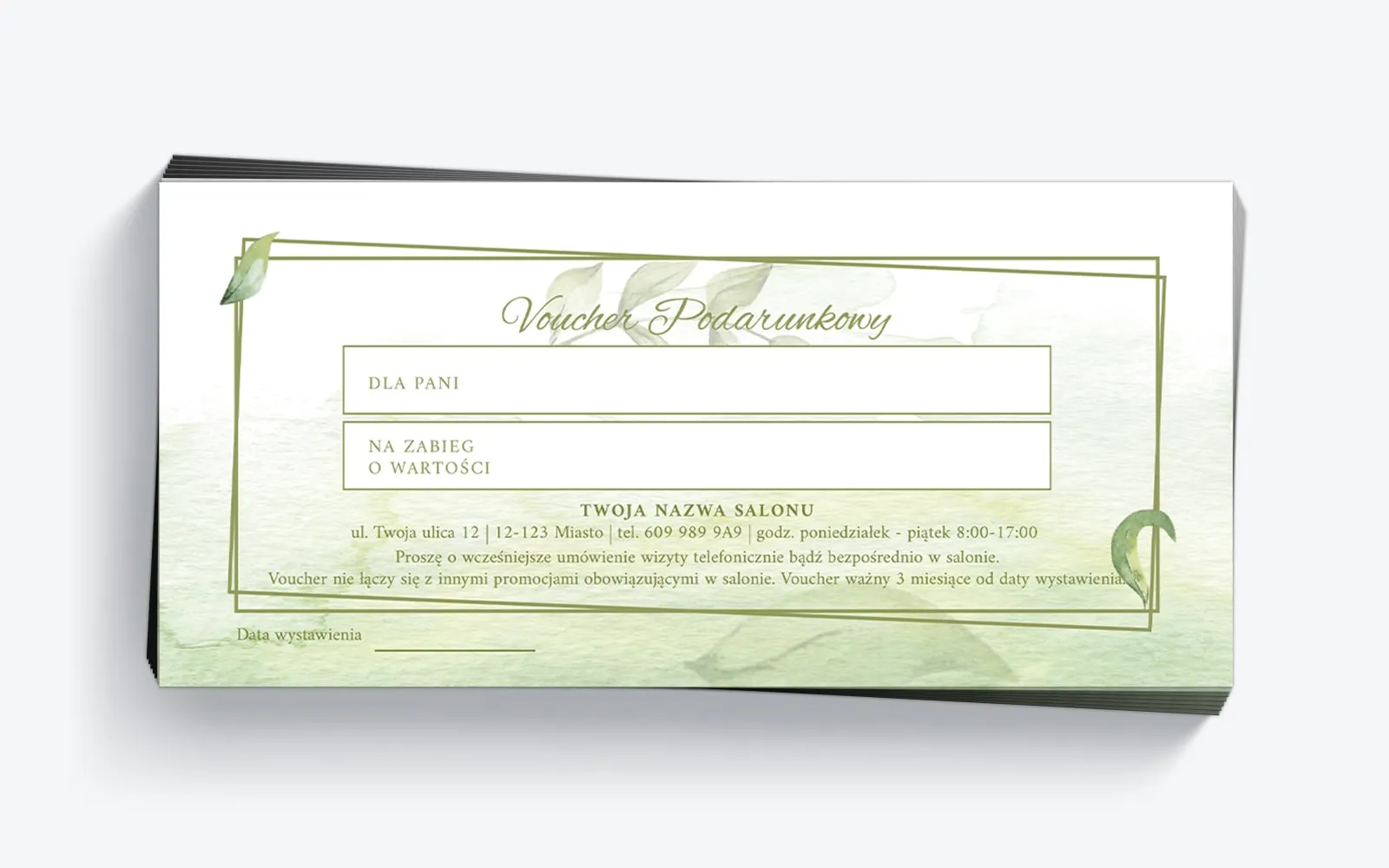 Zielony voucher podarunkowy kosmetyczny w motywem akwarelowego tła