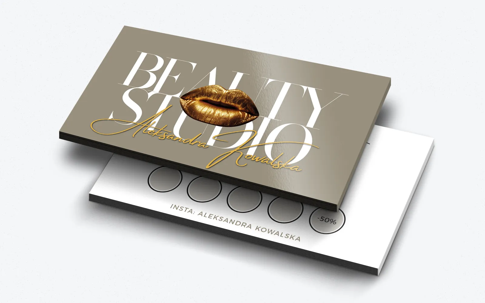 Wizytówka łączy w sobie elementy krzykliwe i wyzywające, takie jak złote usta, z elegancją i klasą, dzięki szeryfowym fontom i stonowanemu tłu. Całość tworzy niezwykle spójny i atrakcyjny wizerunek, który przyciąga uwagę i buduje zaufanie klientek.