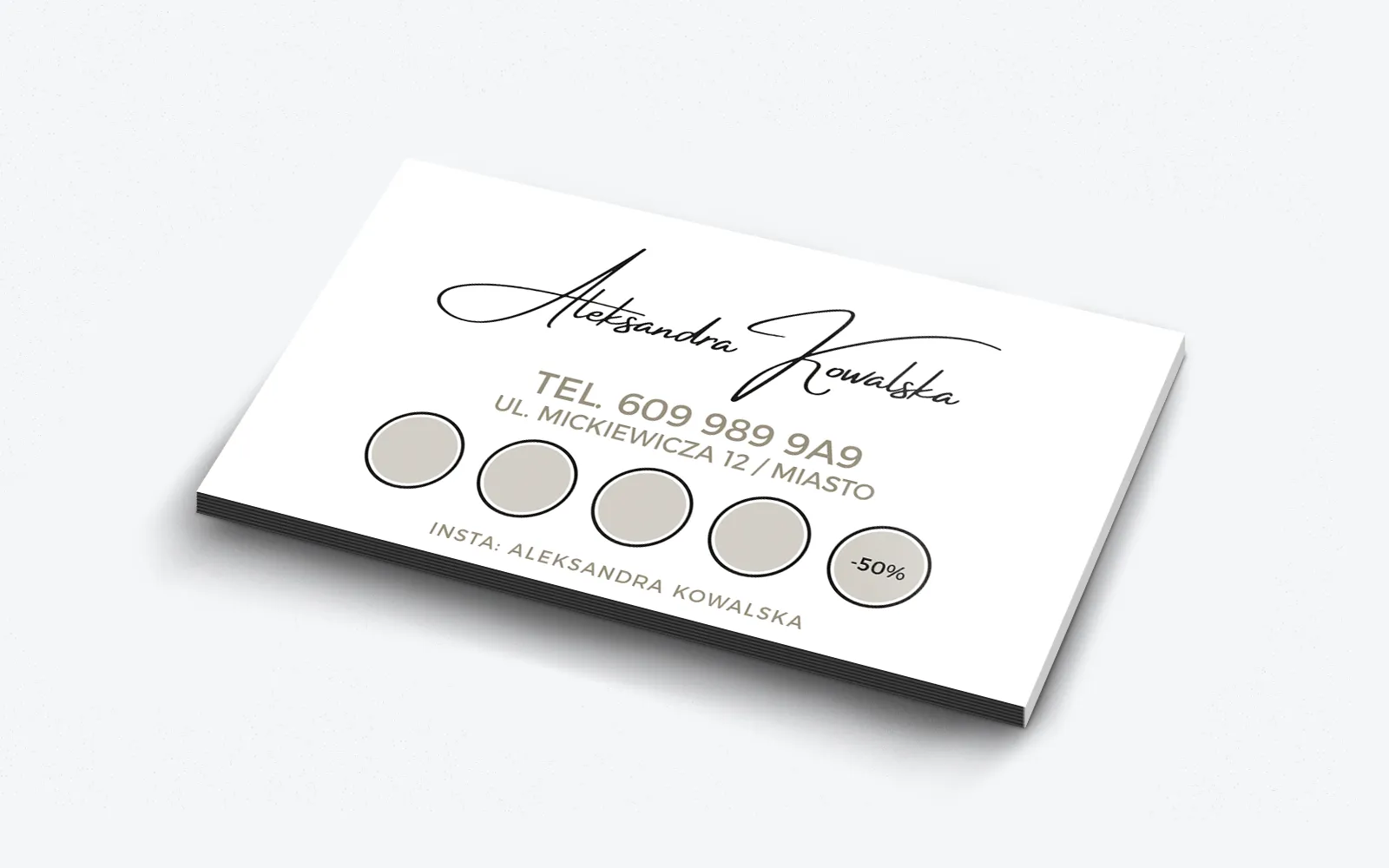 Tył wizytówki jest utrzymany w białej kolorystyce, co zapewnia czytelność i spójność z frontem. Główną część zajmuje ozdobny napis z imieniem i nazwiskiem specjalistki. Niżej znajdują się standardowo numer kontaktowy, adres salonu i adres profilu społecznościowego. Dodatkowym elementem są kółeczka na zbieranie pieczątek, które służą jako system lojalnościowy, zachęcający do częstszych wizyt i korzystania z rabatów.