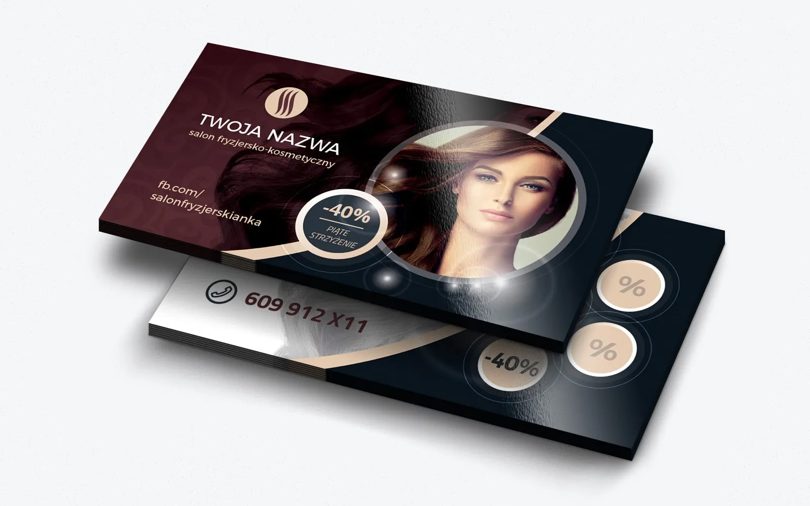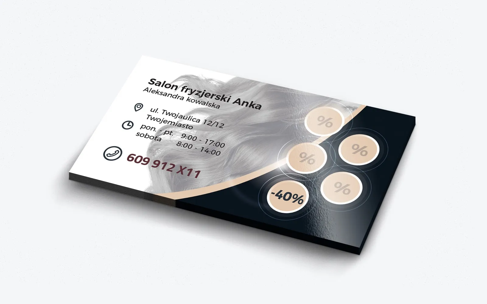 Jakimi elementami można wzbogacić wizytówkę firmową, by stała się jeszcze skuteczniejszym narzędziem promocyjnym? Odpowiedź znajdziemy, spoglądając na prezentowaną wizytówkę dla salonu fryzjersko-kosmetycznego, oferującego makijaże, zabiegi pielęgnacyjne, stylizację paznokci oraz strzyżenia i koloryzacje. Zawsze głównymi elementami są dane teleadresowe, które są niezbędne w przypadku pozyskiwania nowych klientów, ponieważ ułatwiają szybki kontakt z salonem. Jednakże co ze stałymi klientami, którzy są kluczowi dla długoterminowego sukcesu firmy? Część z nich korzysta z usług różnych specjalistek, co oznacza, że ich lojalność nie jest gwarantowana. Dlaczego nie zwiększyć szans na powrót do naszego salonu poprzez zastosowanie dodatkowych elementów, które wzmacniają relację z klientem? Można to zrobić poprzez dwa kluczowe elementy: