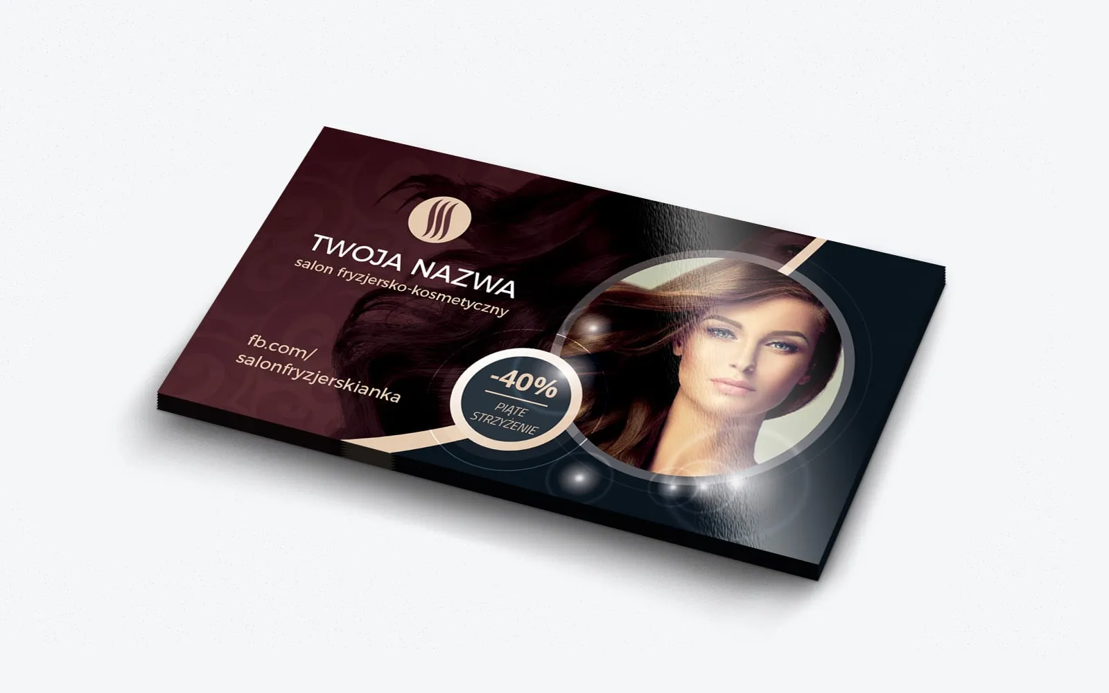 Te elementy oferty zostały zawarte na tej wizytówce fryzjersko-kosmetycznej wraz z konkretnym przykładem usługi, która jest wykonywana w salonie, co pomaga w lepszym zrozumieniu oferty przez klienta. Dzięki temu wizytówka po części zaczyna odgrywać rolę także ulotki informacyjnej, na której również są stosowane podobne zabiegi, co znacznie zwiększa jej efektywność promocyjną, zapewniając lepsze dotarcie do odbiorców. Ponadto projekt cechuje się niezwykle ciekawym i dynamicznym zestawieniem kolorystycznym brązu, grafitu i bieli z dodatkiem delikatnego pudrowego różu, co nadaje całości elegancki, ale zarazem nowoczesny charakter. W połączeniu ze zdjęciem tematycznym nasuwa skojarzenia z kobiecością, ale także siłą i pewnością siebie, a także jakością i wysokim standardem usług, które oferuje salon. Fotografia przedstawia bowiem kobietę o przenikliwym spojrzeniu, z piękną cerą i długimi, zadbanymi włosami, co jednoznacznie komunikuje profesjonalizm i dbałość o szczegóły. Wizytówka zawiera także typowe dla niej elementy, takie jak nazwa firmy na pierwszej stronie w postaci logo oraz jej dane adresowe i kontaktowe na odwrocie, co zapewnia spójność i pełną informację dla klienta. Warto zawrzeć na niej także adres fanpage’a na popularnym portalu społecznościowym, ponieważ te dwie metody promocji firmy dobrze się uzupełniają, zwiększając zasięg i zaangażowanie klientów.
