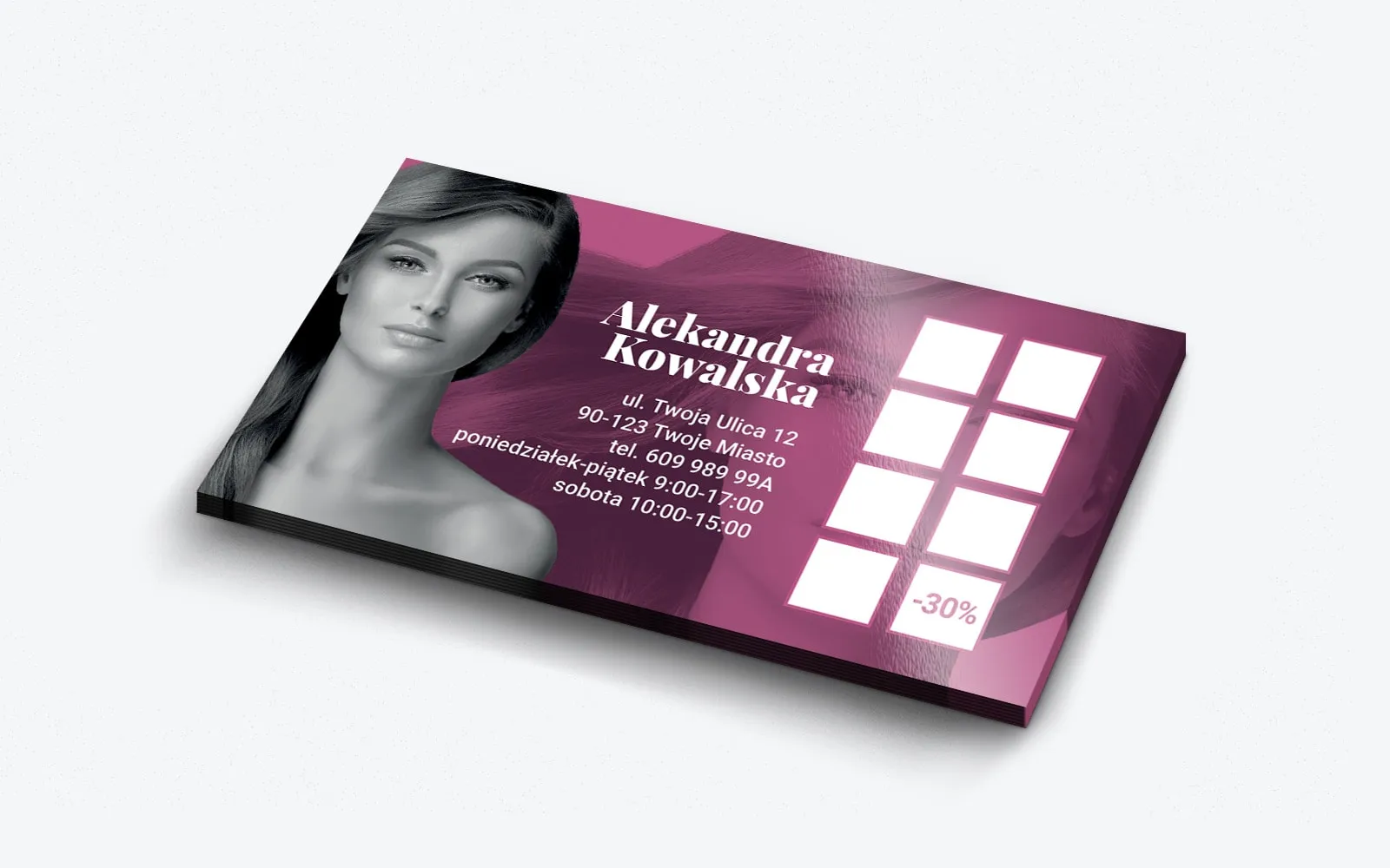 Wizytówka fryzjerska z kwadracikami na program lojalnościowy – utrzymanie klientek i wzmocnienie relacji