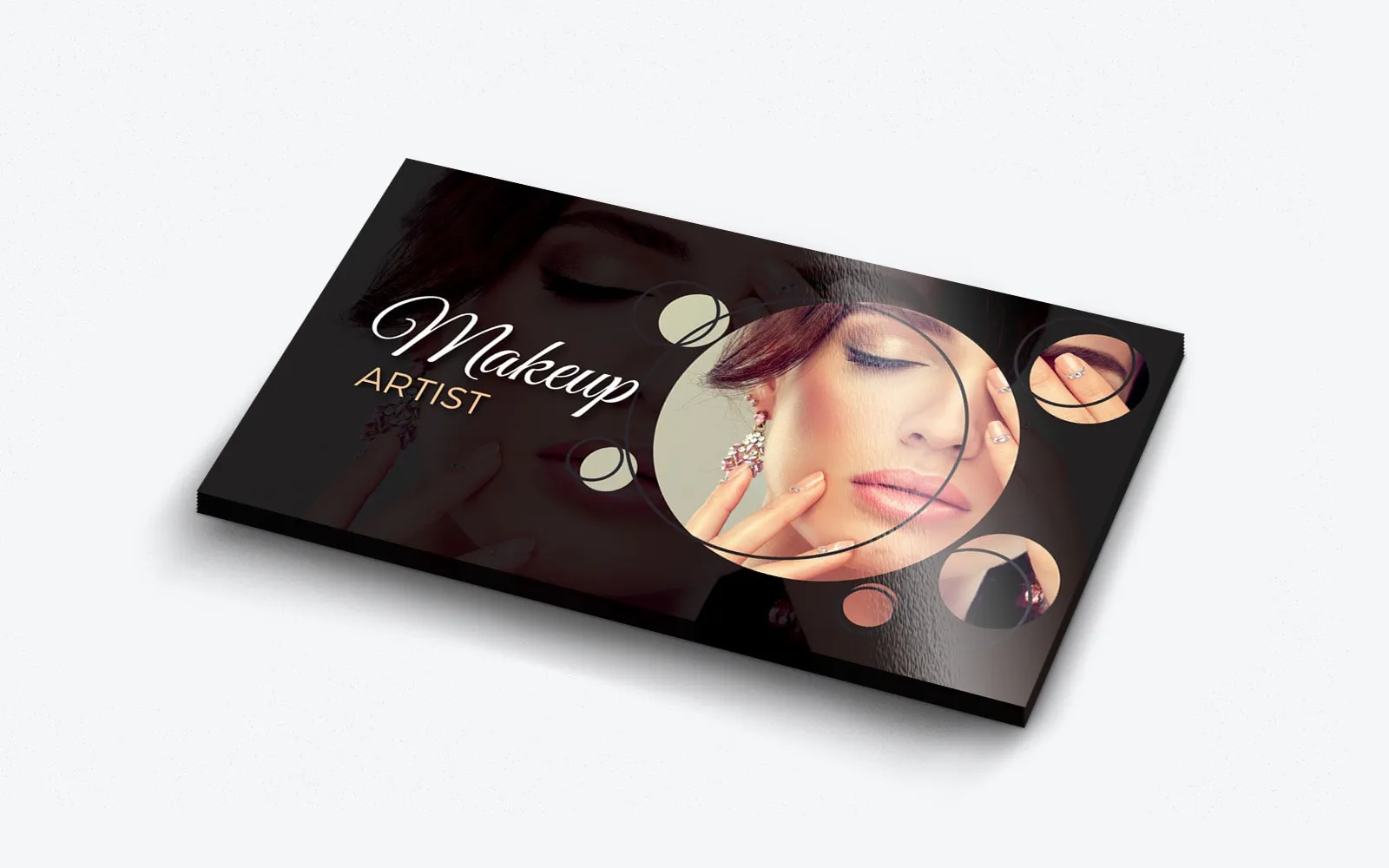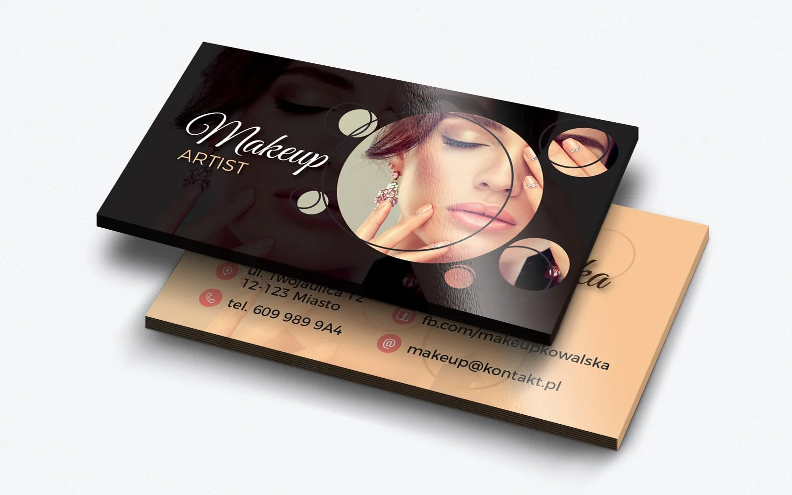 Na pierwszej stronie wizytówki dominuje zdjęcie kobiety w charakterystycznym makijażu i stylizacji, które zostało podzielone na okręgi, co nadaje projektowi unikalny charakter. Tego typu kompozycja graficzna sprawia, że wizytówka staje się wyjątkowa i z pewnością zapadnie w pamięć osobie, która ją otrzyma. Ciekawy zabieg graficzny z podziałem zdjęcia na okręgi tworzy dynamiczny efekt, który jest rzadko spotykany w projektach tego typu. Dodatkowo na frontowej części umieszczono napis „Makeup Artist”, co od razu wskazuje na specjalizację właścicielki wizytówki.