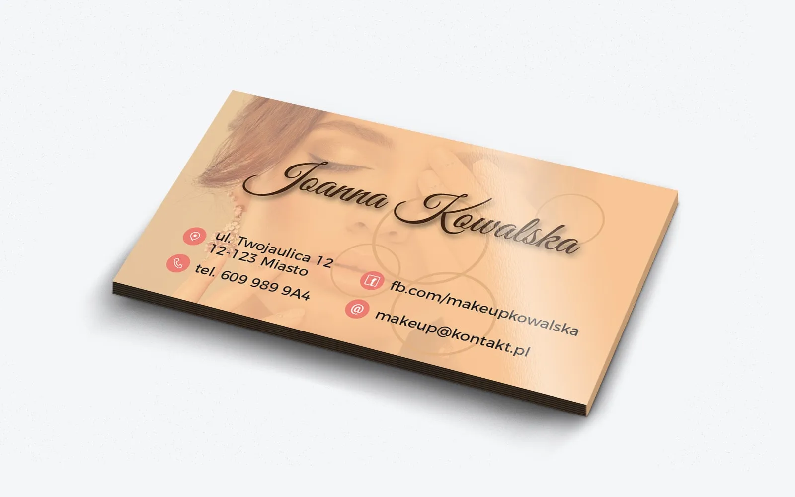 Rewers projektu stanowi harmonijne odwrócenie kolorów z pierwszej strony. Tło jest w kolorze przypominającym odcień podkładu, co doskonale nawiązuje do tematyki beauty. Na tej stronie znajdują się wszystkie niezbędne dane kontaktowe makijażystki, w tym imię i nazwisko zapisane ozdobnym fontem, oraz dane teleadresowe wyróżnione za pomocą ikonek w różowych kółeczkach. Przemyślana kompozycja sprawia, że wizytówka jest nie tylko elegancka, ale również bardzo funkcjonalna, zapewniając łatwy dostęp do informacji.