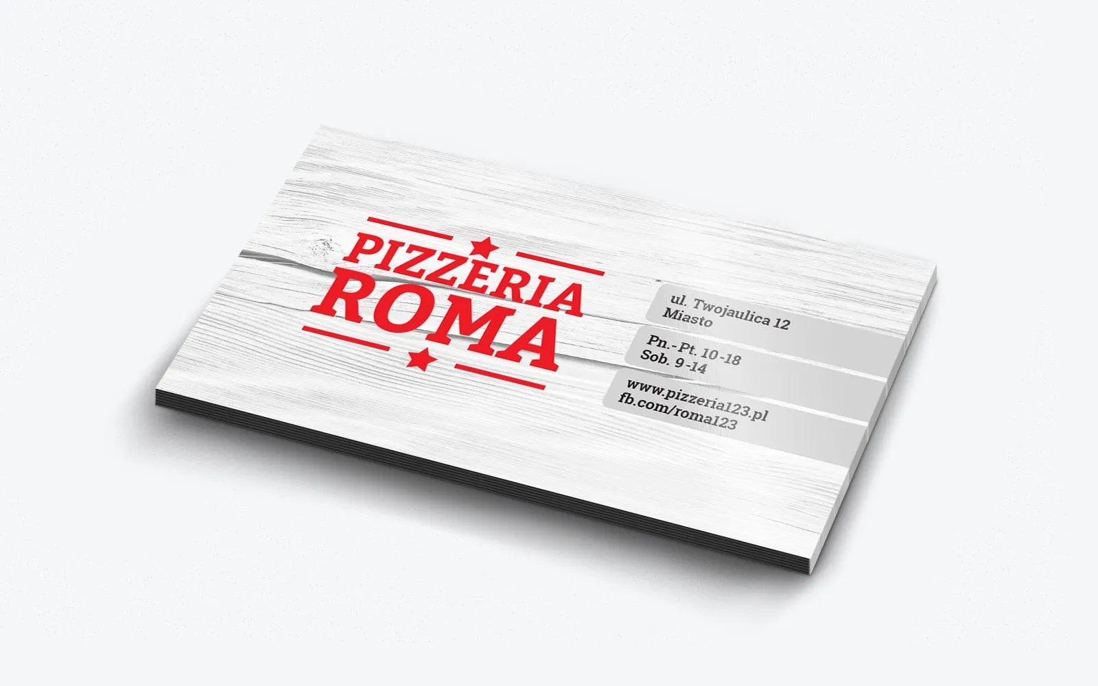 Na odwrocie, na powtórzonym tle z drewnianą teksturą, znajduje się duże, przyciągające wzrok logo firmy, co wzmacnia spójność wizualną całego projektu. Jest ono umieszczone w kolorze czerwonym, co podkreśla jego wyrazistość i ułatwia zapamiętanie marki. Po prawej stronie projektu wizytówki dla pizzerii umieszczone są podstawowe dane teleadresowe, które są niezbędne do nawiązania szybkiego kontaktu z lokalem. Podzielone są na trzy grupy wyróżnione poprzez szare tło, co zwiększa czytelność i funkcjonalność wizytówki. Pierwsza z nich to lokalizacja danego lokalu gastronomicznego, co jest kluczową informacją dla klientów chcących odwiedzić lokal osobiście. Druga grupa to dni i godziny, w których możemy przyjść i zjeść dobry posiłek przy stoliku, co jest istotne dla osób planujących wizytę na miejscu. Trzecia część to adres strony internetowej, gdzie możemy znaleźć całe menu wraz ze zdjęciami oraz adres portalu społecznościowego jakim jest Facebook, co ułatwia klientom dostęp do pełnej oferty i bieżących informacji. Po tej stronie wizytówki dla pizzerii zostaje jeszcze sporo miejsca, dlatego można to wykorzystać na program lojalnościowy czy inne dodatkowe informacje, co może dodatkowo zwiększyć lojalność klientów i zachęcić ich do częstszych wizyt.