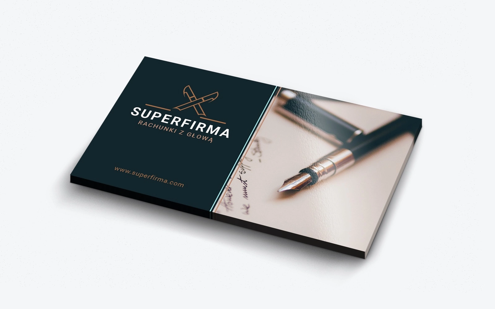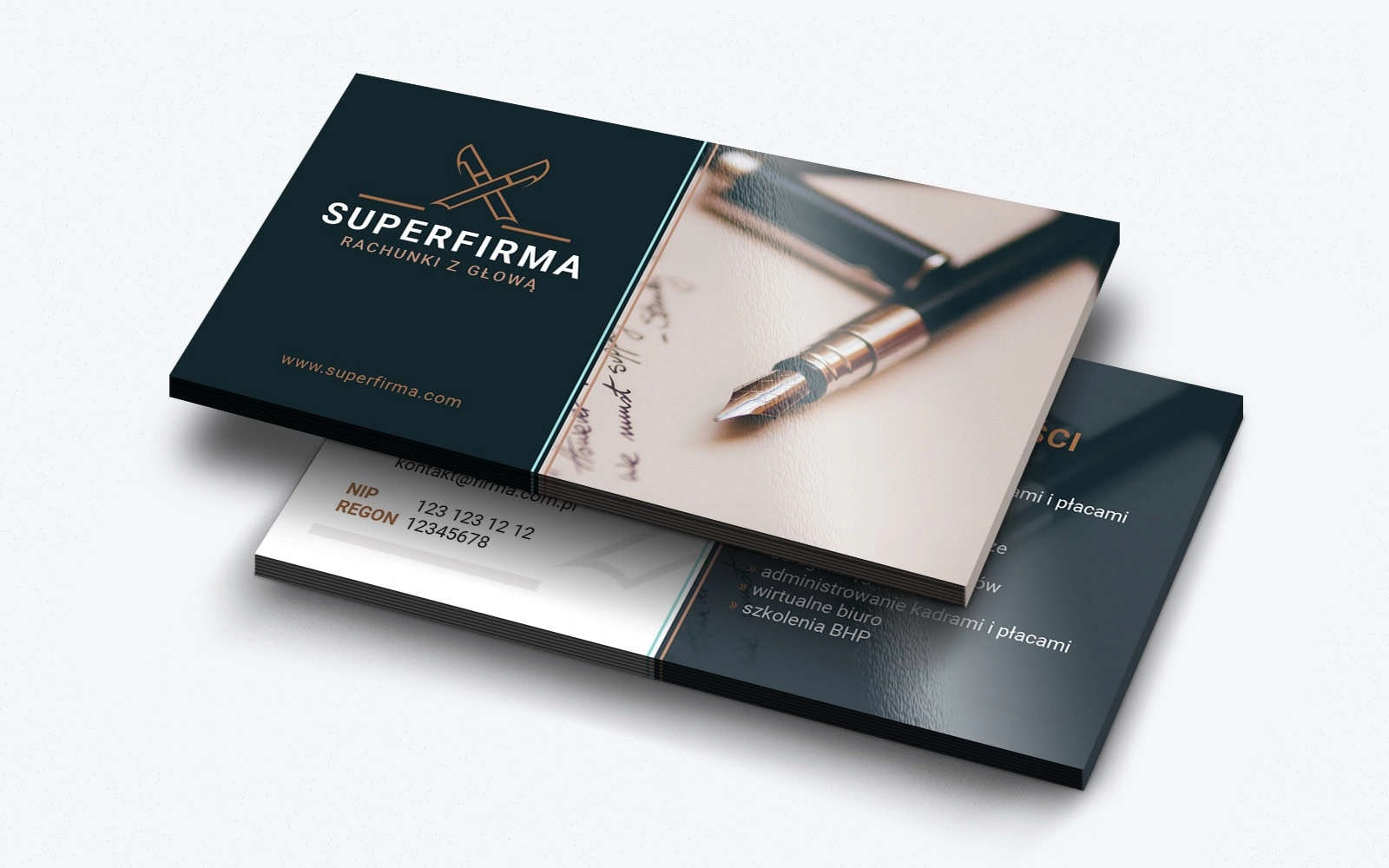 Pierwsza strona wizytówki, podobnie jak druga, została przemyślanie podzielona na dwie części. Na lewej stronie znajduje się logo firmy wraz z hasłem reklamowym „rachunki z głową”, a także adres strony internetowej. Wszystko to umieszczono na eleganckim, ciemnozielonym tle, które dodaje wizytówce klasy i profesjonalizmu. Po prawej stronie, uwagę przyciąga wyróżniające się zdjęcie tematyczne – przedstawienie eleganckiego pióra na tle notatek, co idealnie współgra z tematyką księgowości i rachunkowości.